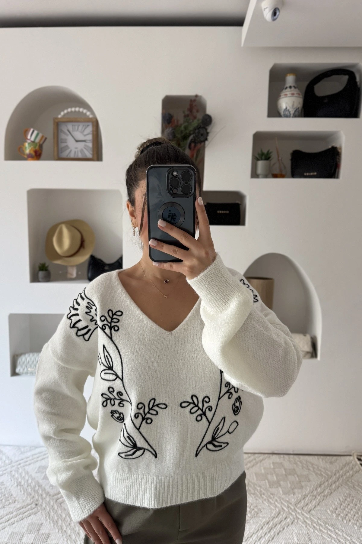 V YAKA MAKROME İP ÇİÇEK İŞLEME KAZAK – EKRU