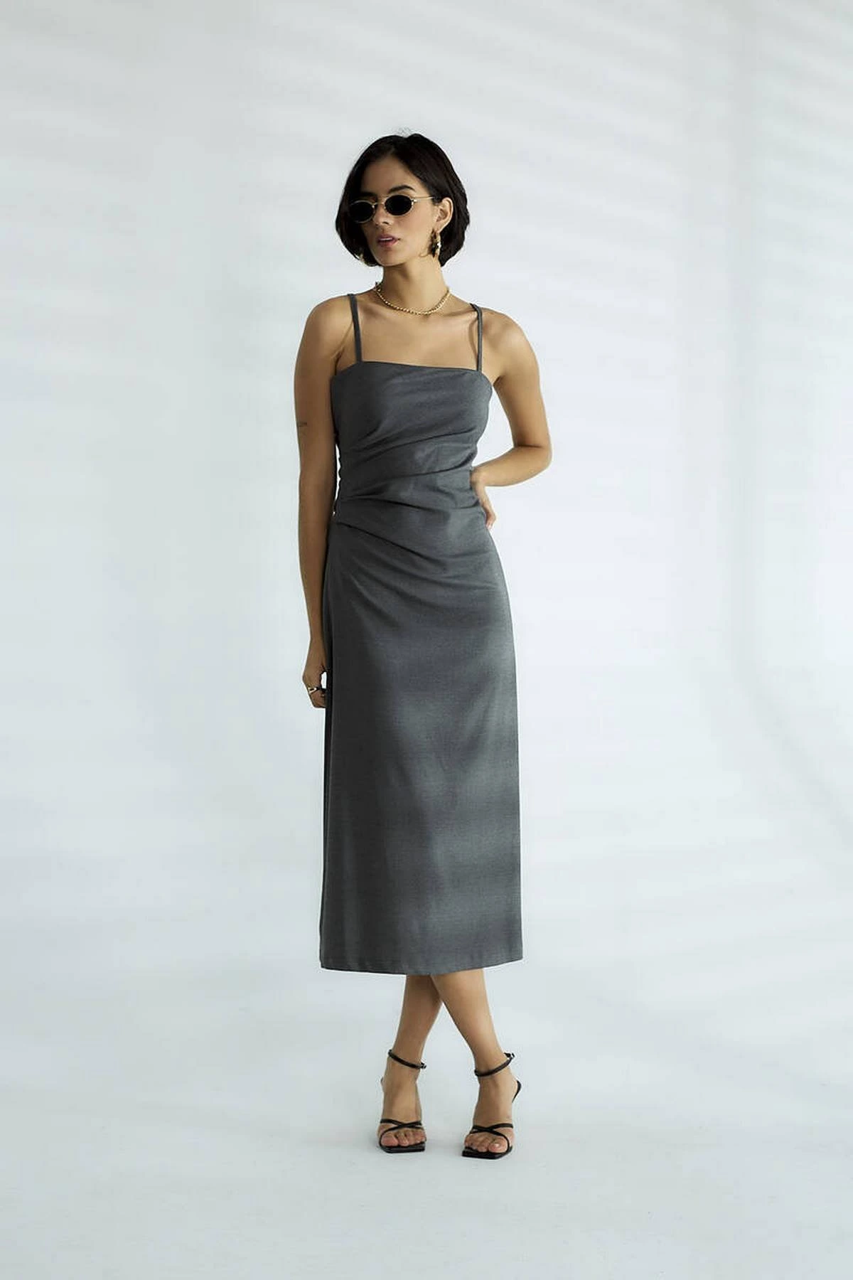 ASKILI YAN DRAPE MİDİ BOY VİSKON ELBİSE – ANTRASİT