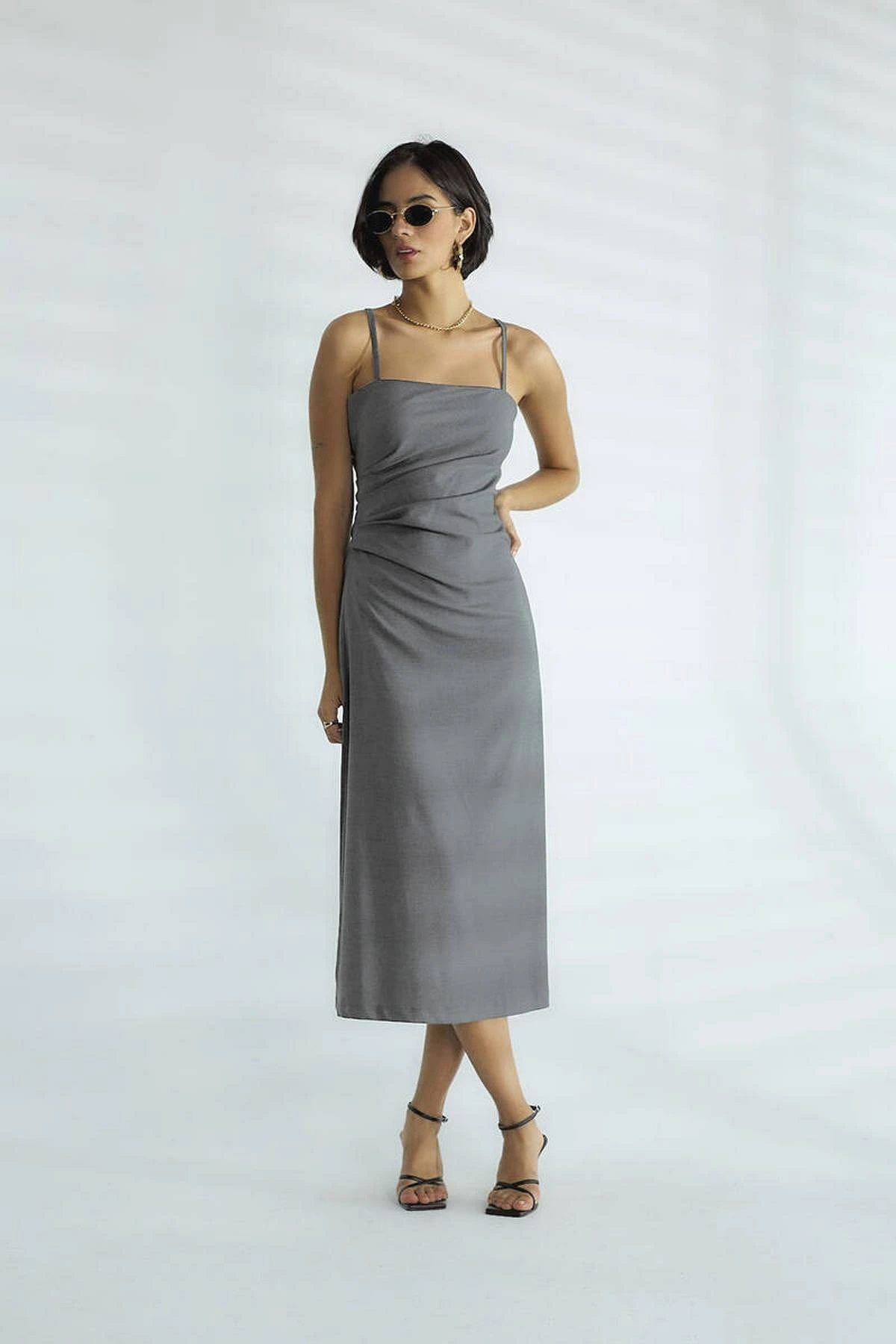 ASKILI YAN DRAPE MİDİ BOY VİSKON ELBİSE – GRİ