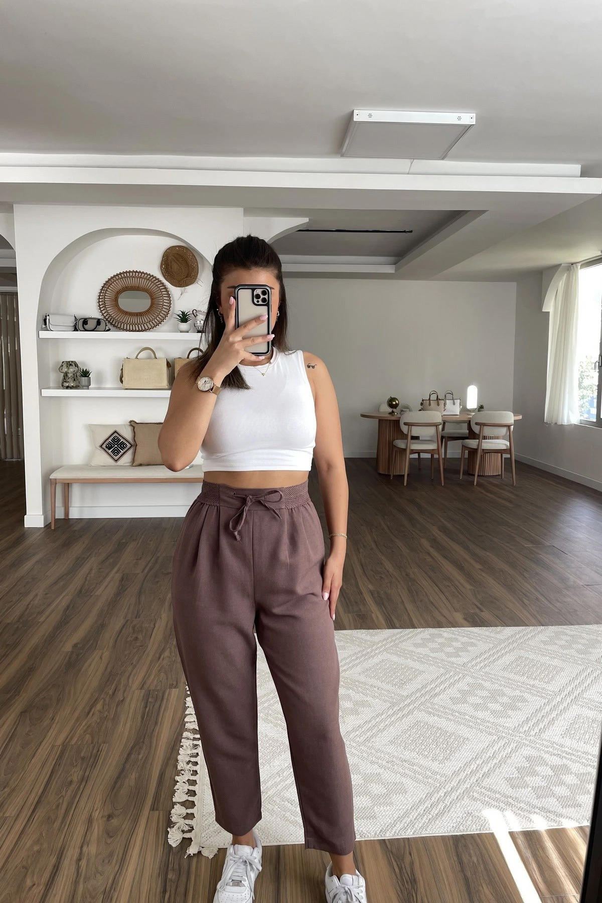 BEL ÖRGÜ LASTİK CEPLİ VİSKOS RAHAT PANTOLON – KAHVE