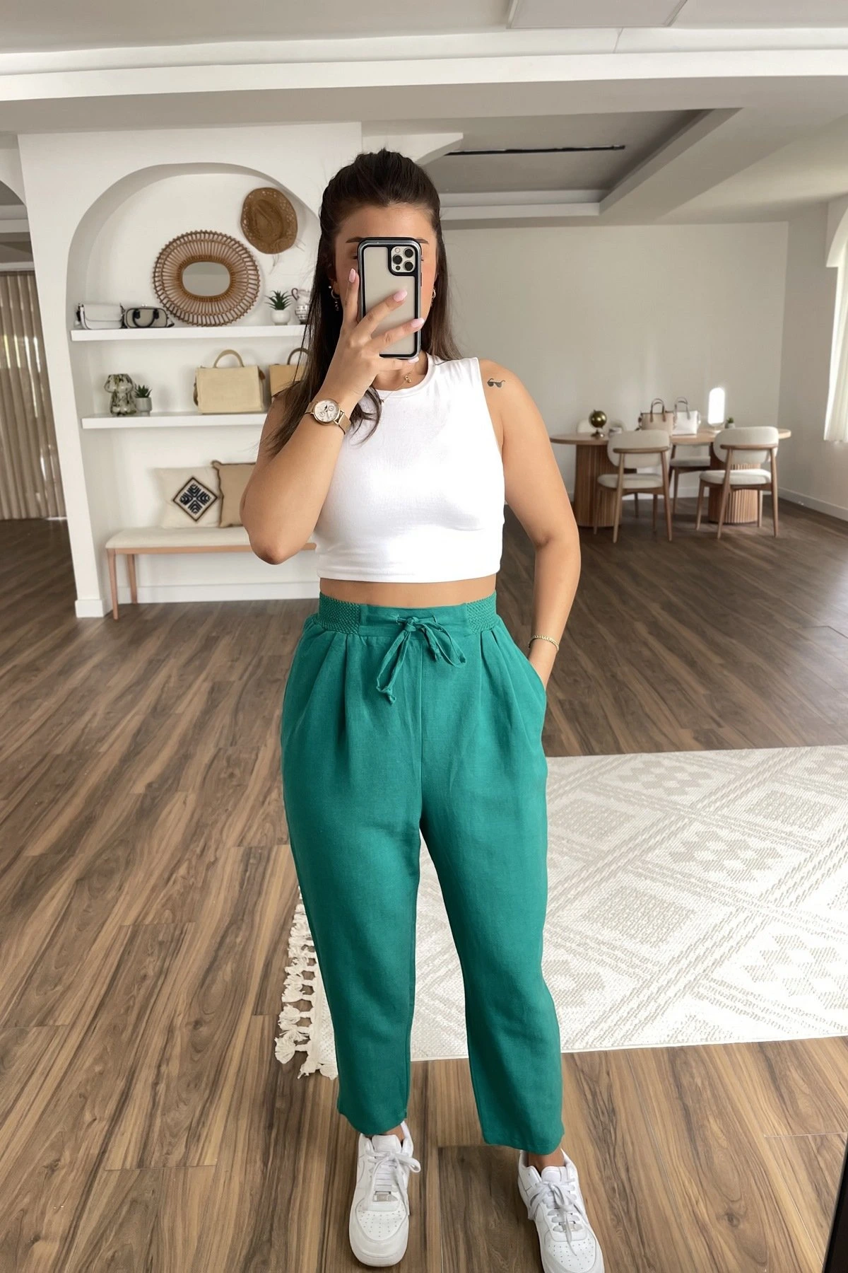 BEL ÖRGÜ LASTİK CEPLİ VİSKOS RAHAT PANTOLON – ZÜMRÜT YEŞİL