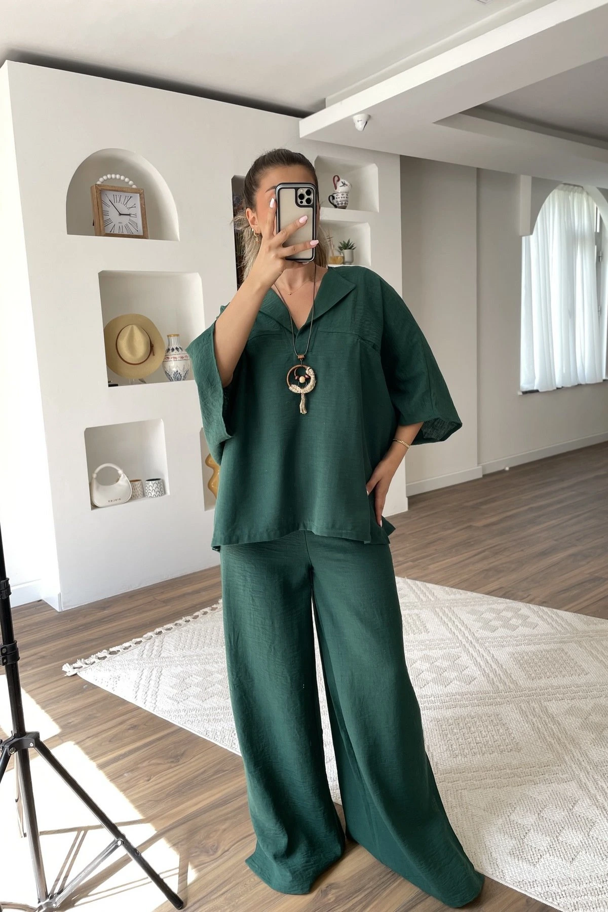 BLUZ PANTOLON YAN YIRTMAÇ DÜŞÜK OMUZ VİSKON TAKIM – ZÜMRÜT YEŞİL