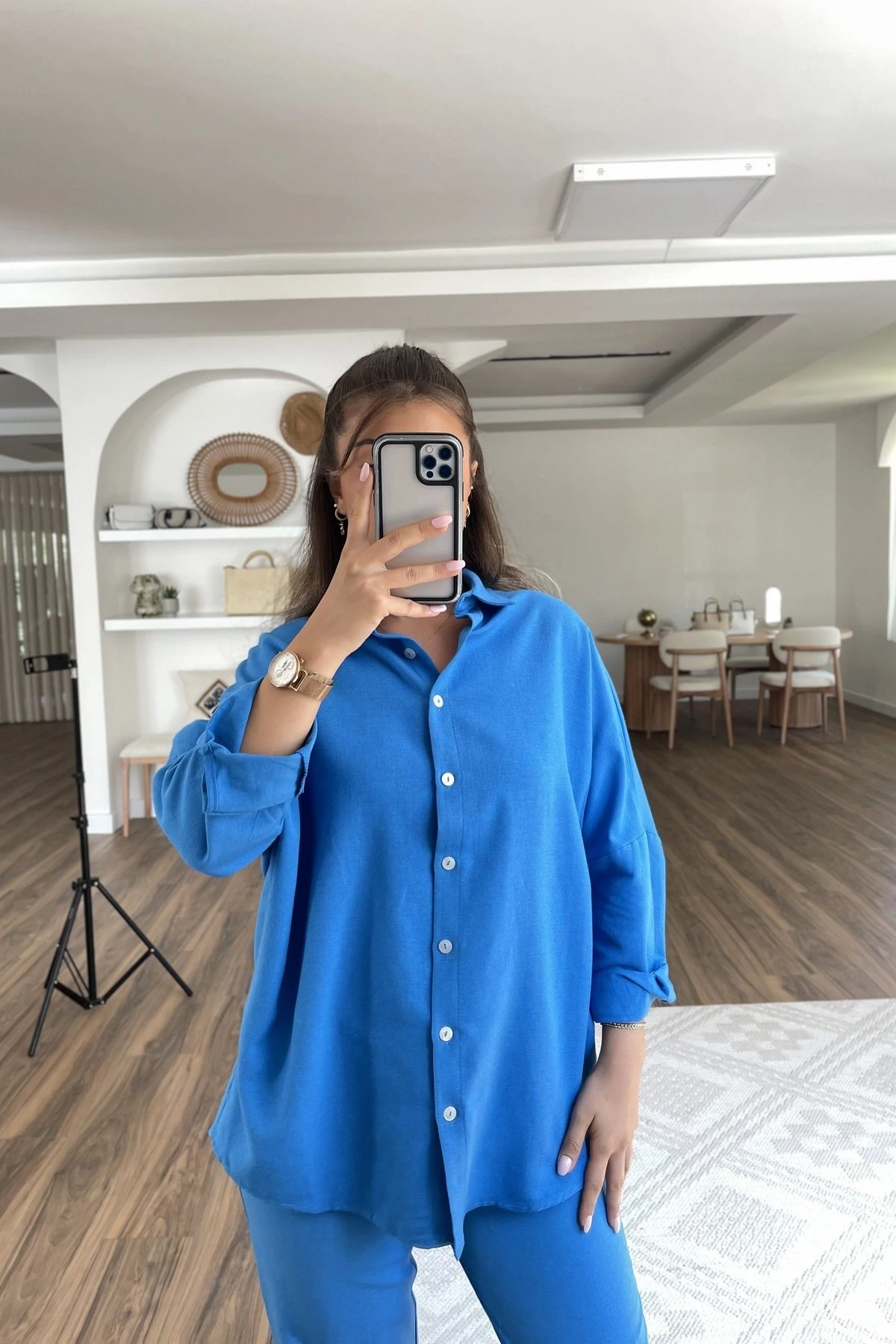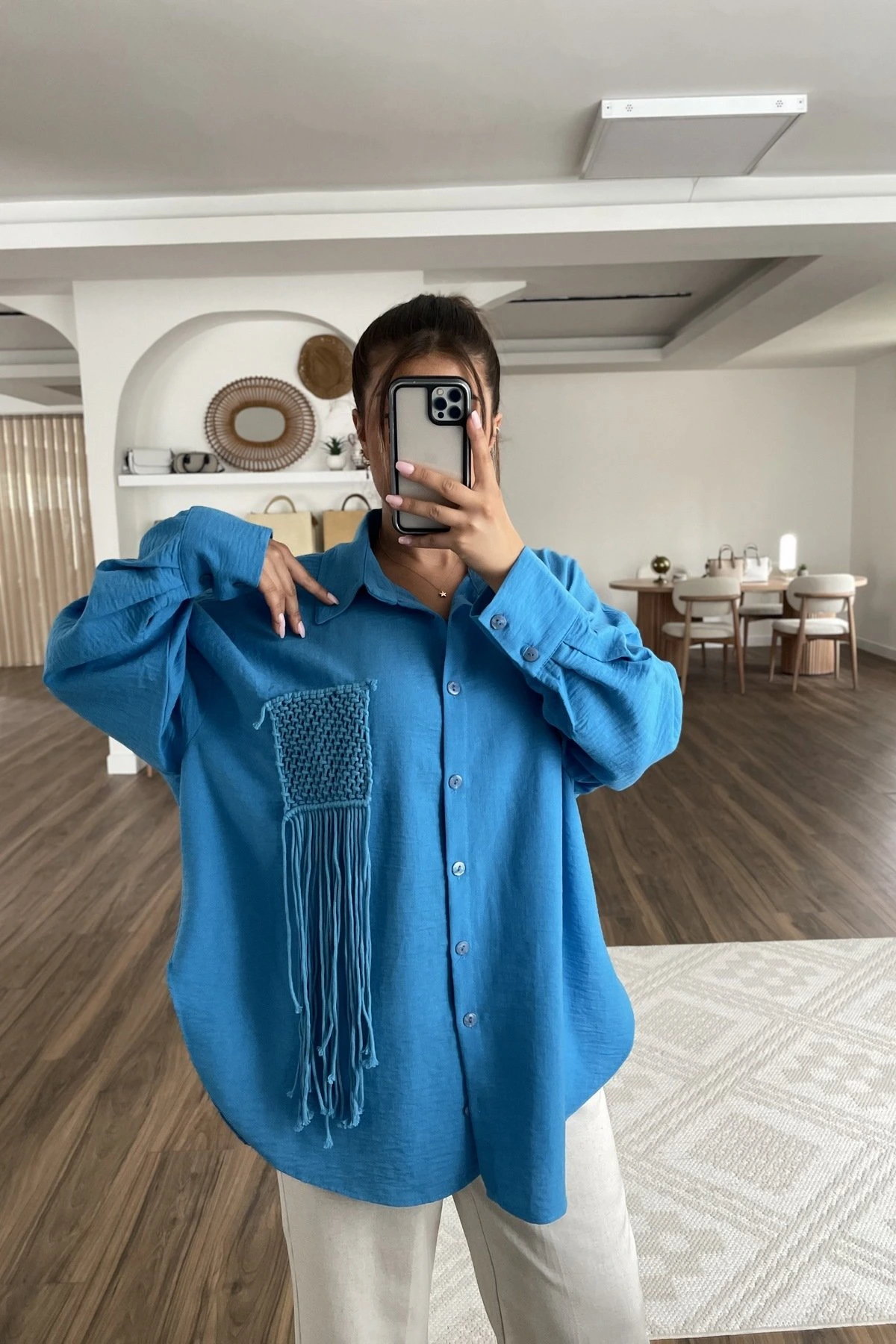OVERSİZE VİSKON KETEN GÖMLEK – SAKS