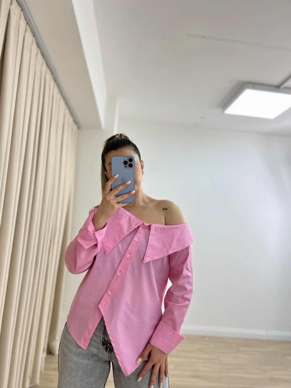 GENİŞ YAKA ASİMETRİK PAMUK GÖMLEK – PEMBE