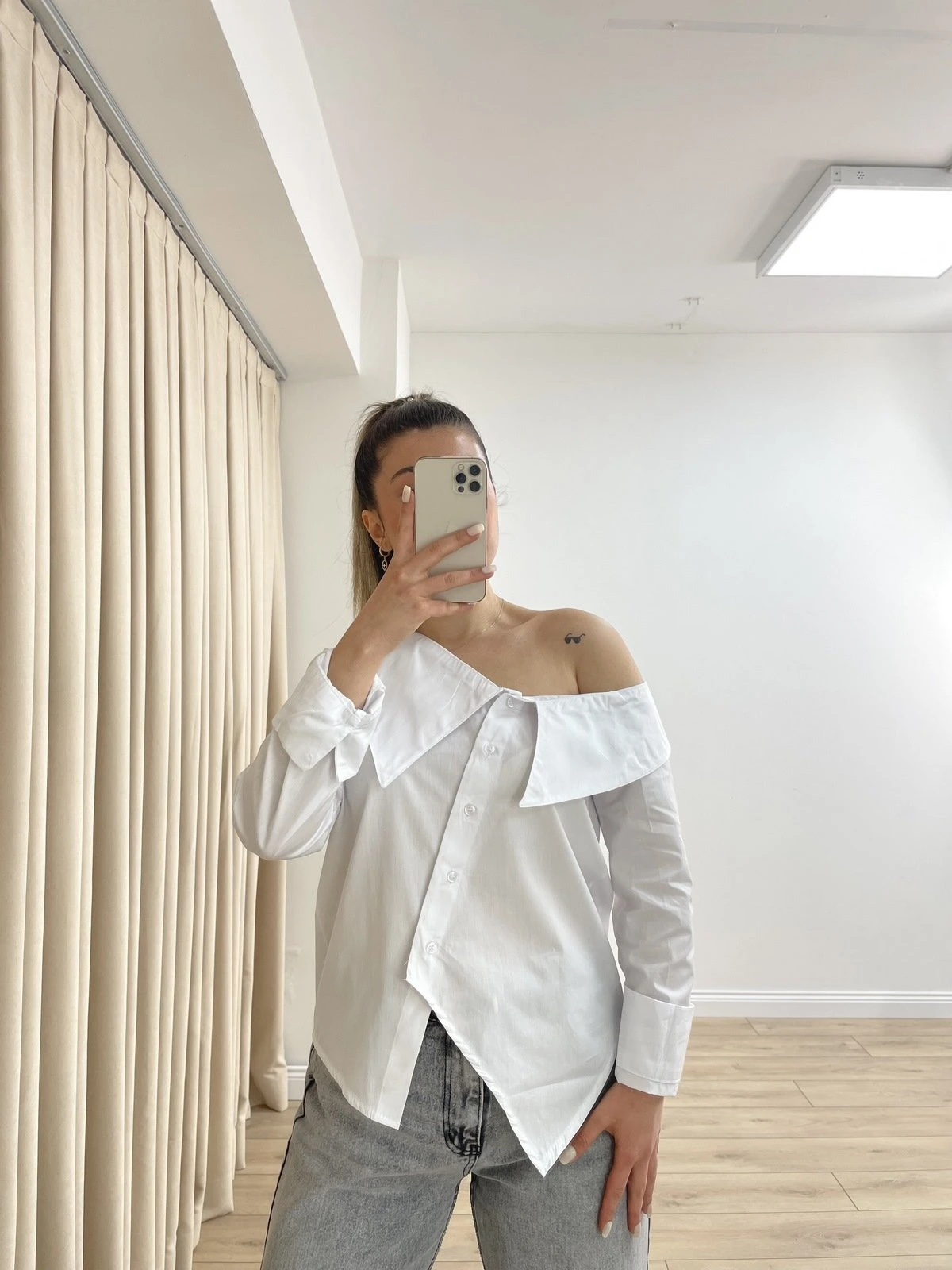 GENİŞ YAKA ASİMETRİK PAMUK GÖMLEK – BEYAZ
