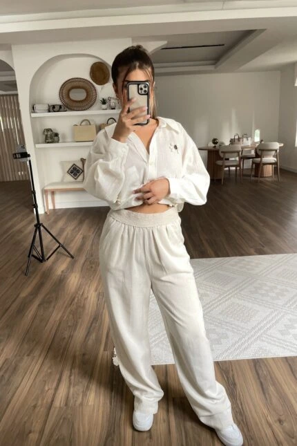 FERMUARLI CROP CEKET ÖN DİKİŞLİ PANTOLON TAKIM – BEYAZ