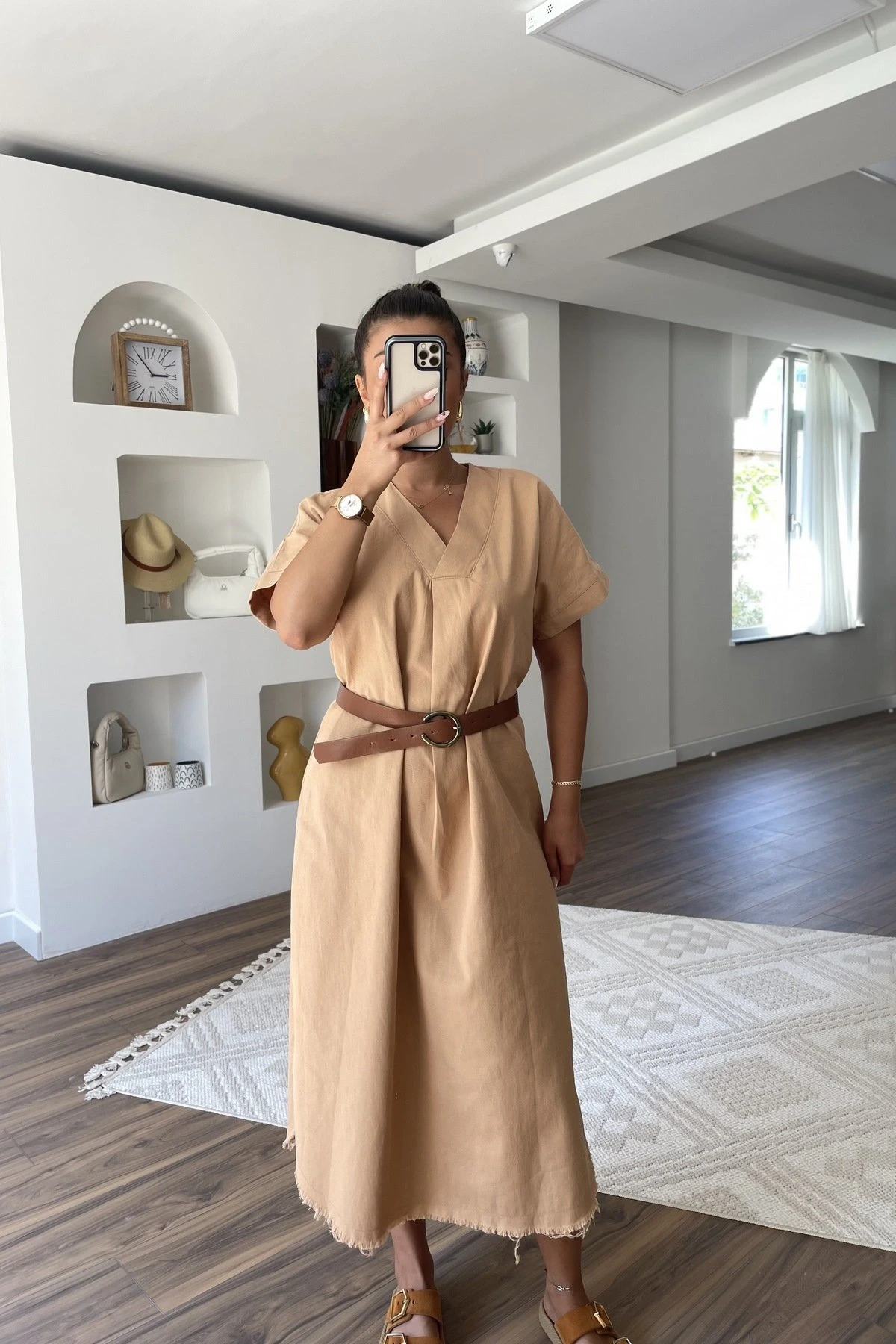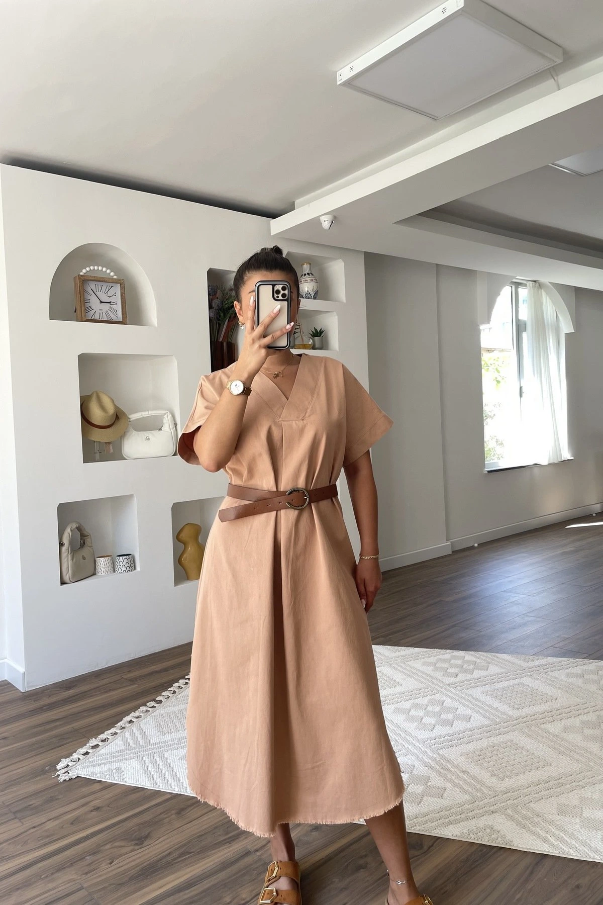 V YAKA ETEĞİ OVAL KEMERLİ PAMUK SALAŞ ELBİSE – CAMEL