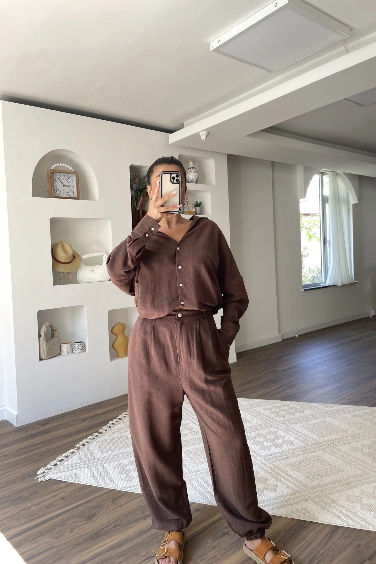 V YAKA GÖMLEK BİLEK LASTİK PANTOLON VİSKON TAKIM – KAHVE