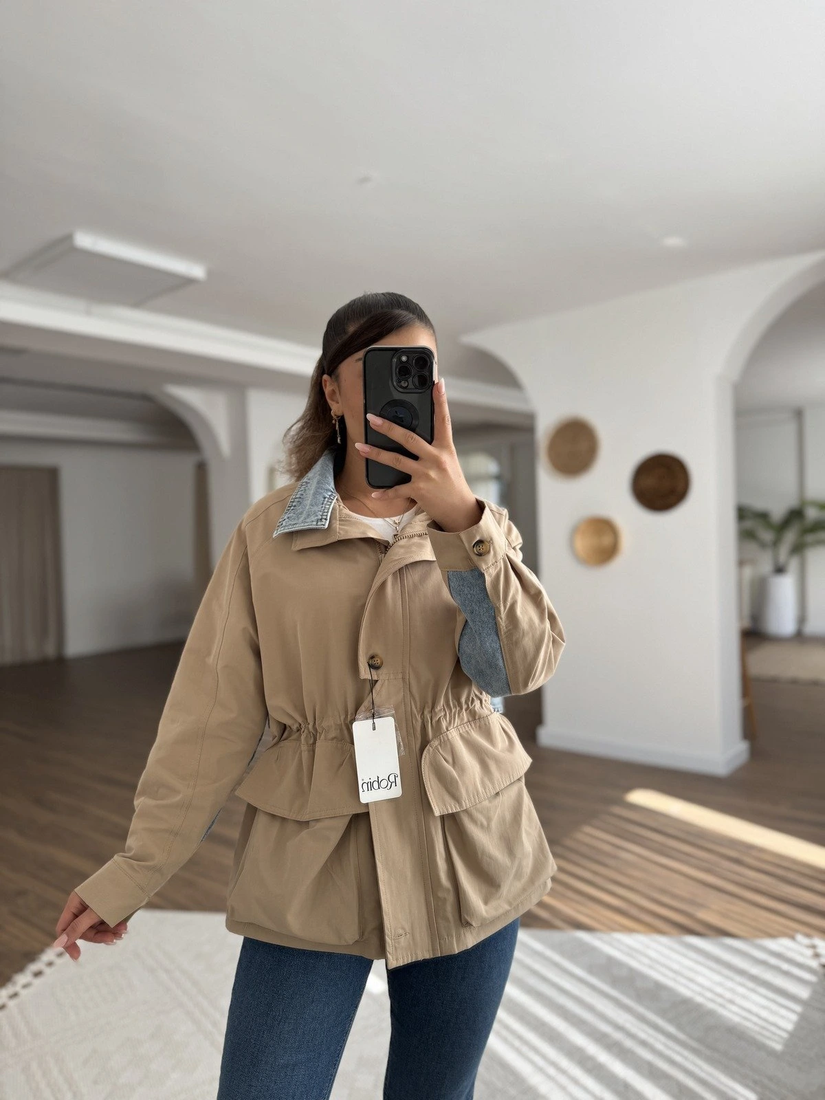 KAPÜŞONLU BEL BÜZGÜ CEP DETAY VİSKON KISA TRENÇ – TAŞ