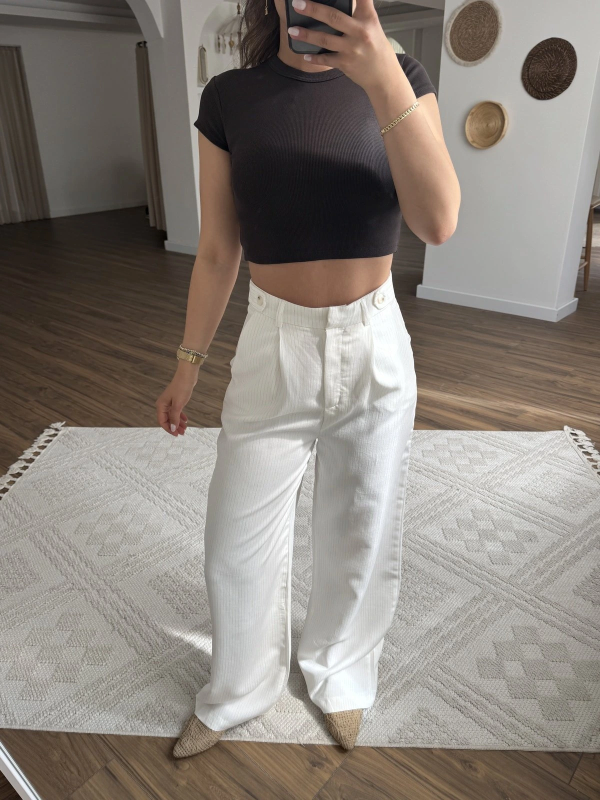 BEL DÜĞME BRİT ÇİZGİ DOKU PALAZZO VİSKON KETEN PANTOLON – BEYAZ