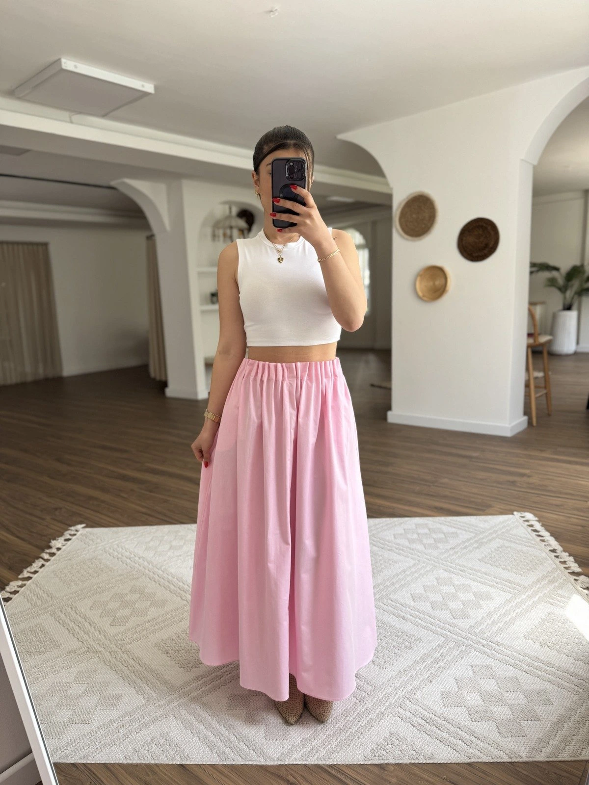 BEL FIRFIR LASTİK CEPLİ PAMUK UZUN ETEK – PEMBE