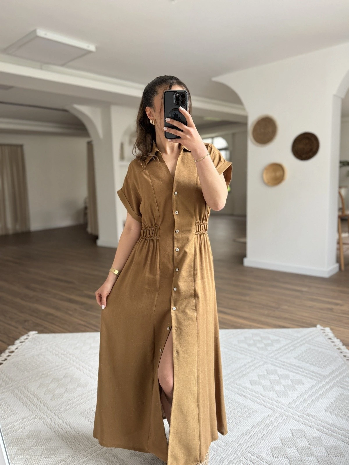 DÜŞÜK KOL BEL BÜZGÜ DETAY VİSKON KETEN GÖMLEK ELBİSE – TABA