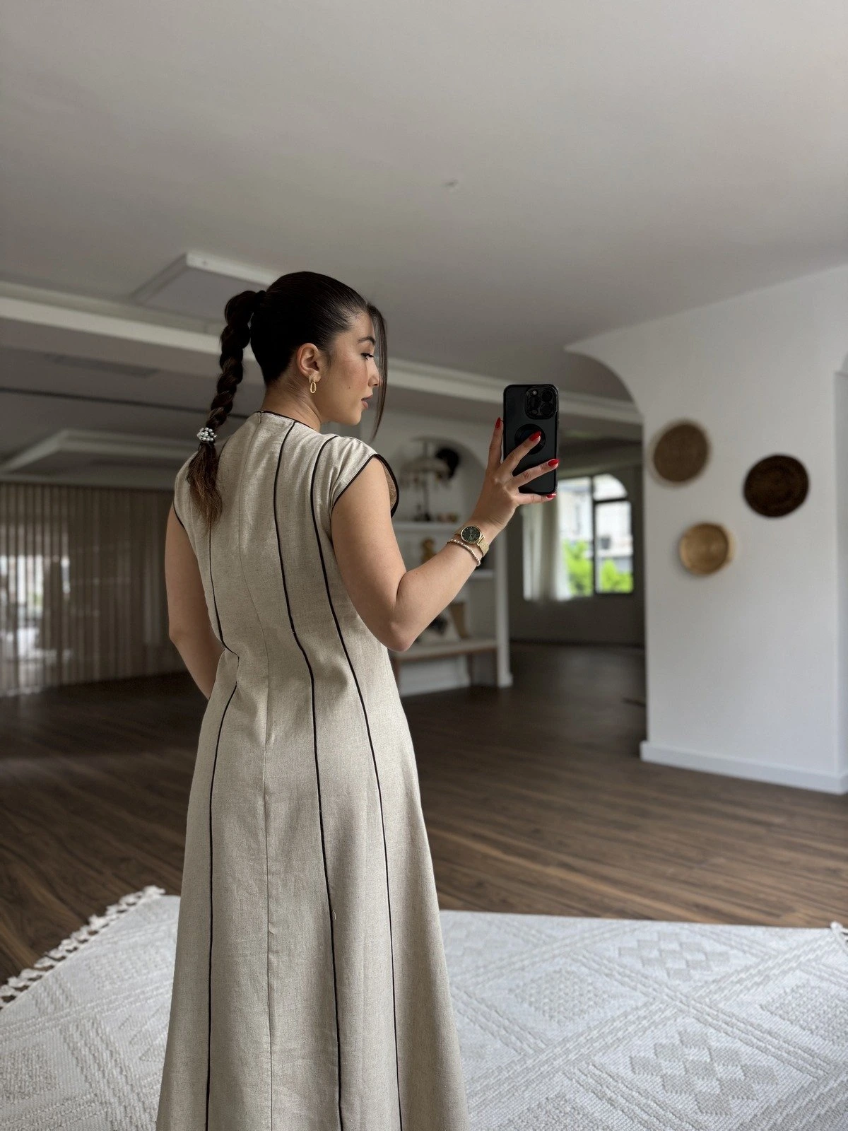 JAPONE KOL RENK BİYE PAMUK KETEN ELBİSE – TAŞ