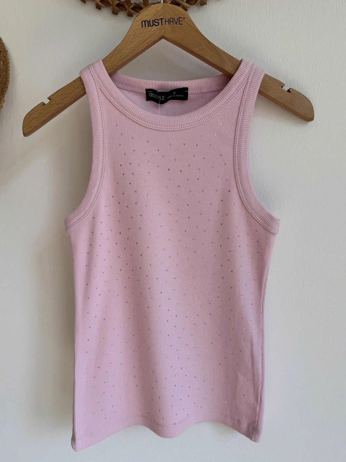 ÖN TAŞ BASKI HALTER YAKA FİTİLLİ PAMUK ATLET – PEMBE