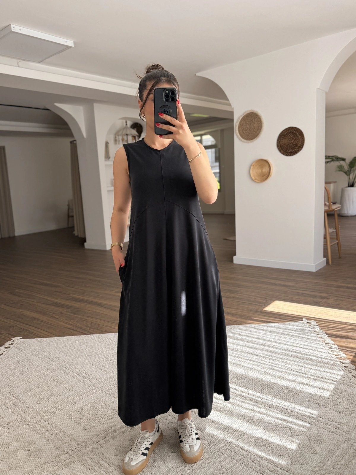 SIFIR KOL DİKİŞ DETAY CEPLİ UZUN ELBİSE – SİYAH