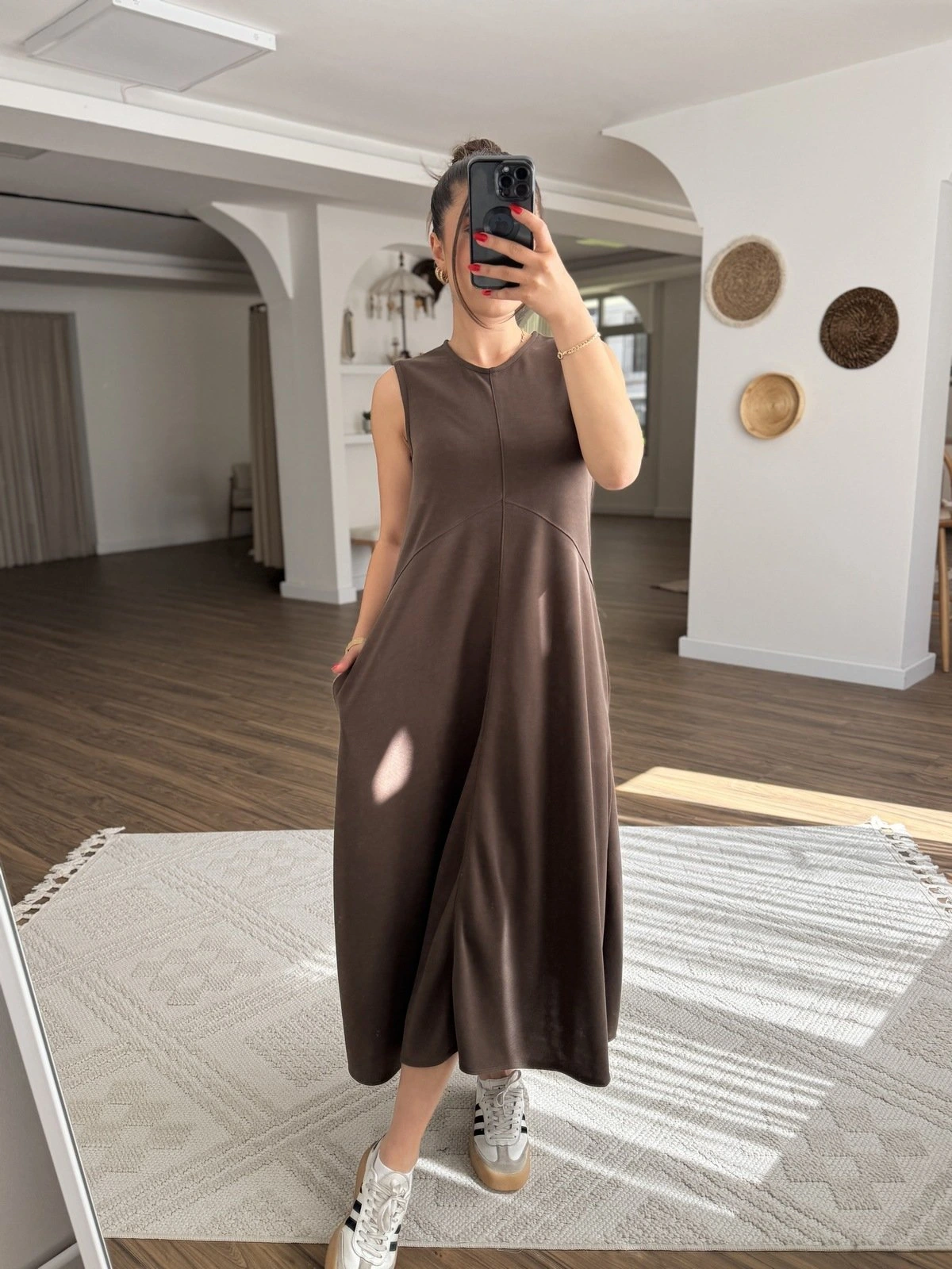 SIFIR KOL DİKİŞ DETAY CEPLİ UZUN ELBİSE – KAHVE