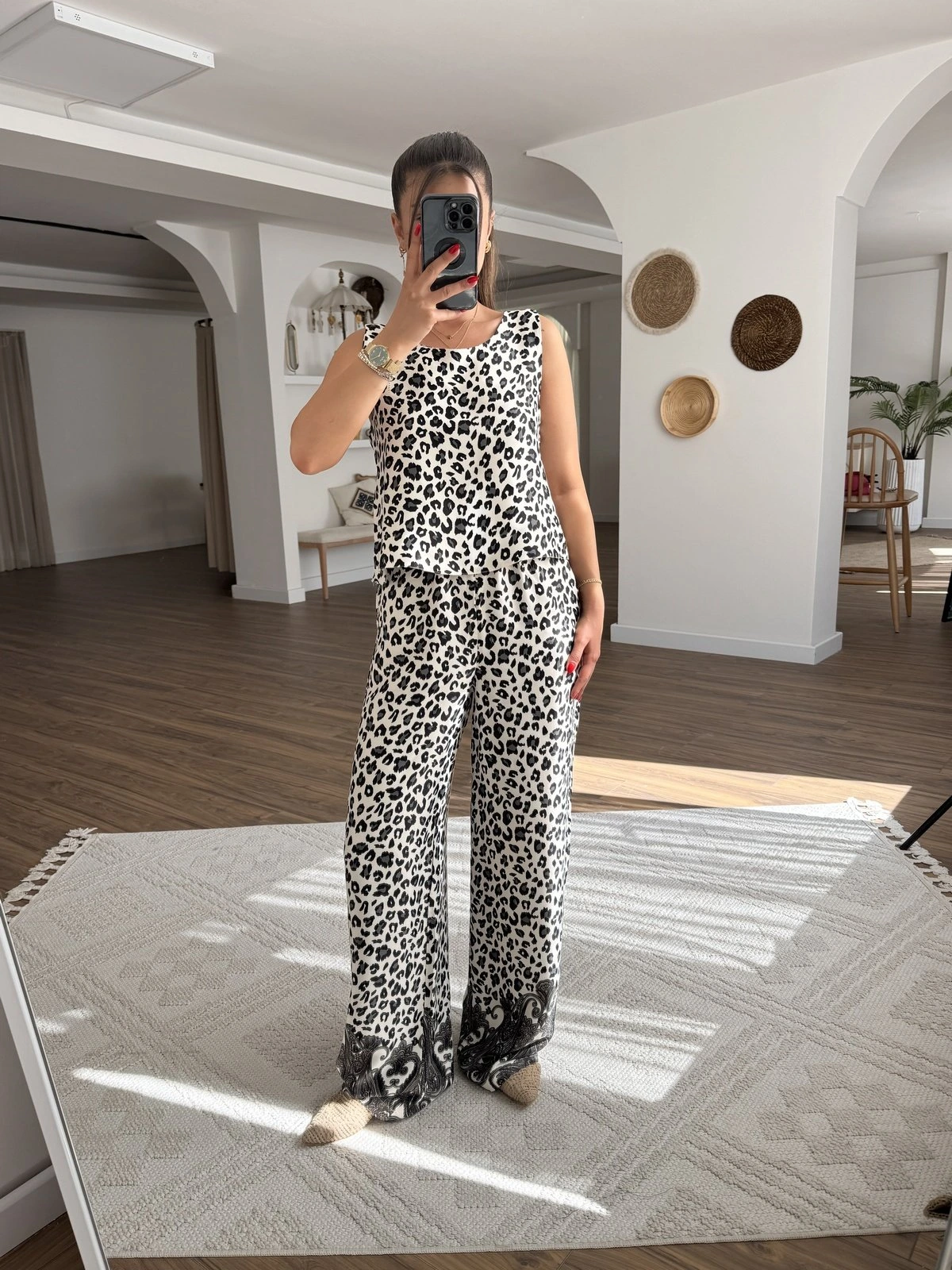 SIFIR KOL LEOPAR DESEN JAKARLI BLUZ PANTOLON TAKIM – GRİ
