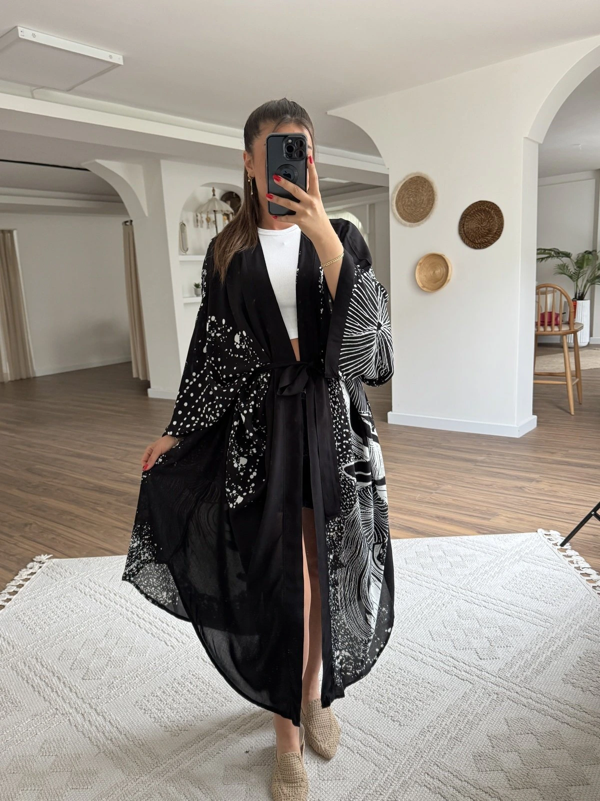 SİLÜET DESEN KUŞAKLI TAŞ SERPME UZUN VİSKON KİMONO – SİYAH