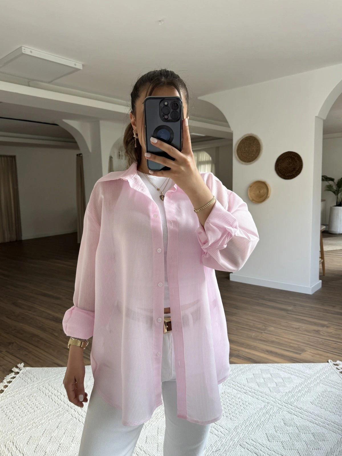 TRANSPARAN ÇİZGİLİ VİSKON SALAŞ GÖMLEK – PEMBE