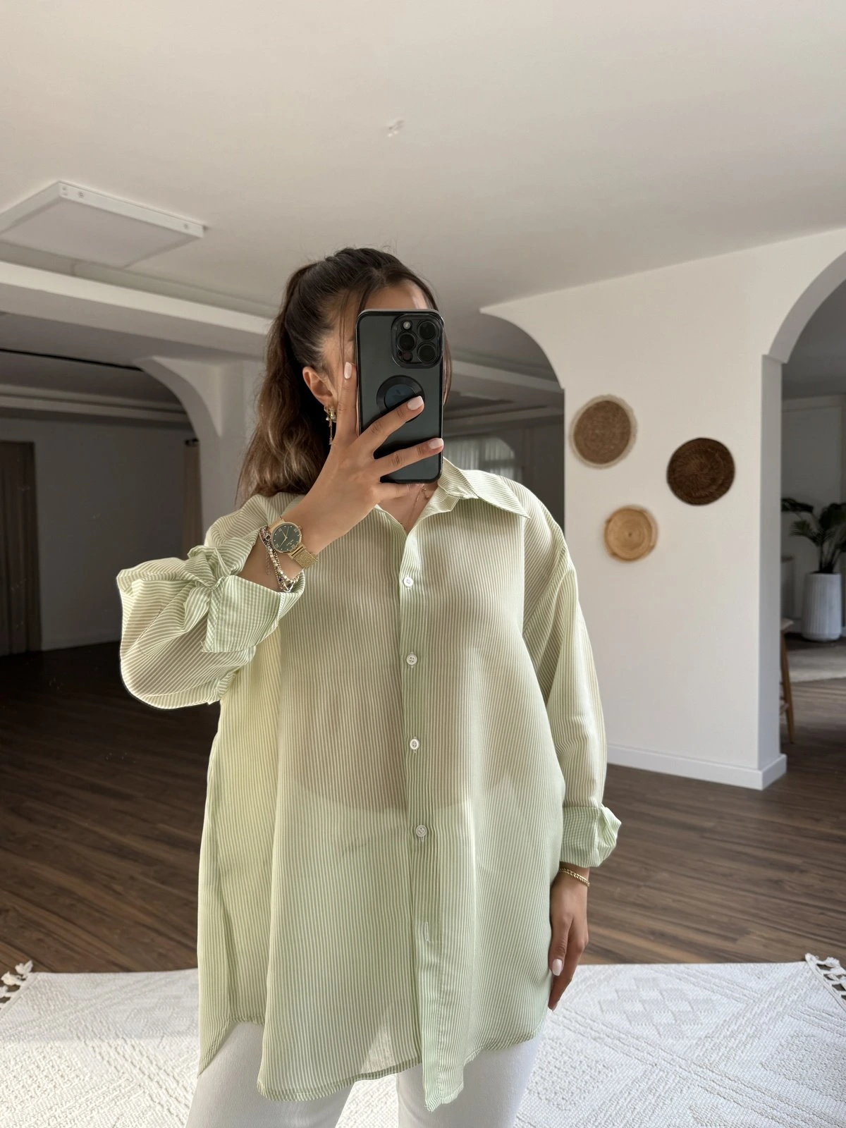 TRANSPARAN ÇİZGİLİ VİSKON SALAŞ GÖMLEK – YEŞİL
