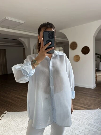 TRANSPARAN ÇİZGİLİ VİSKON SALAŞ GÖMLEK – MAVİ
