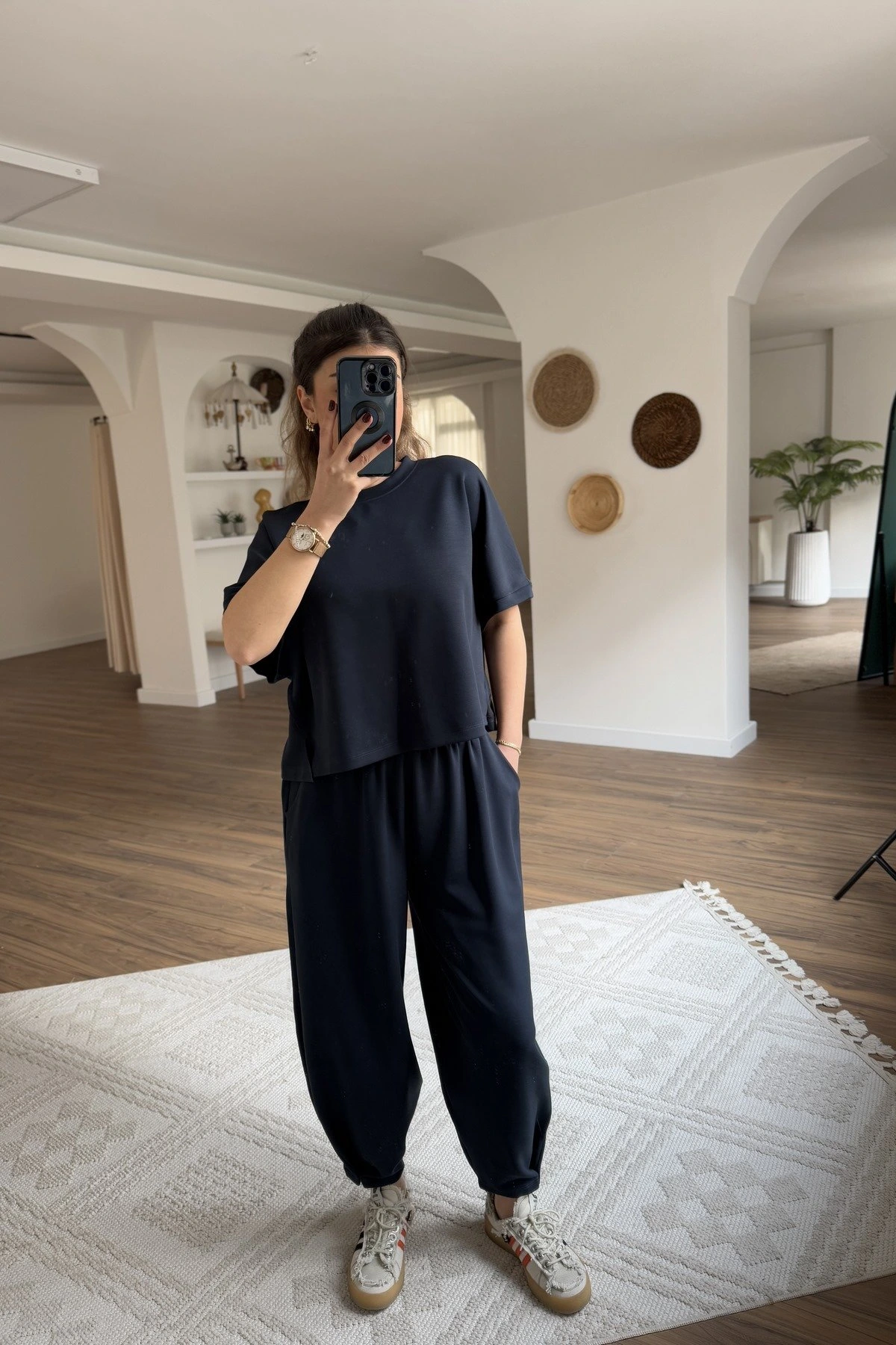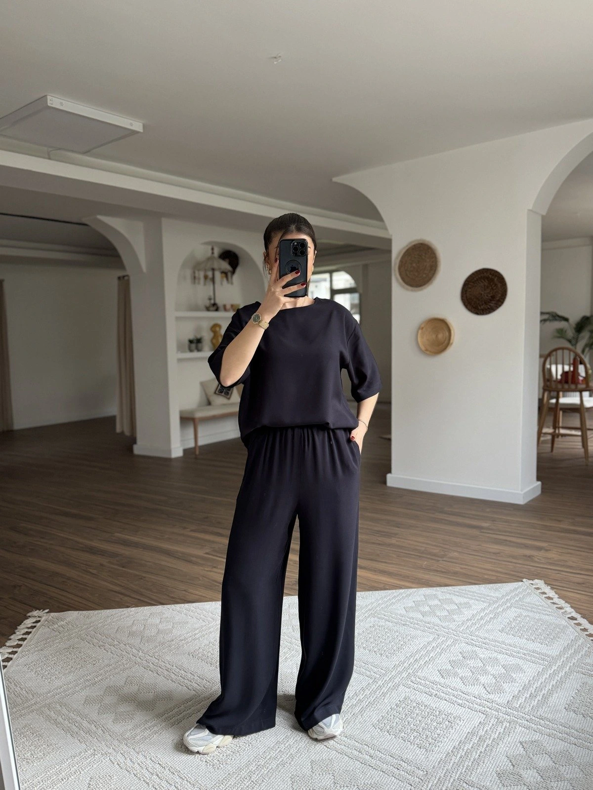 ENSE PENCERE ETEĞİ OVAL BLUZ PANTOLON VİSKON TAKIM – LACİVERT