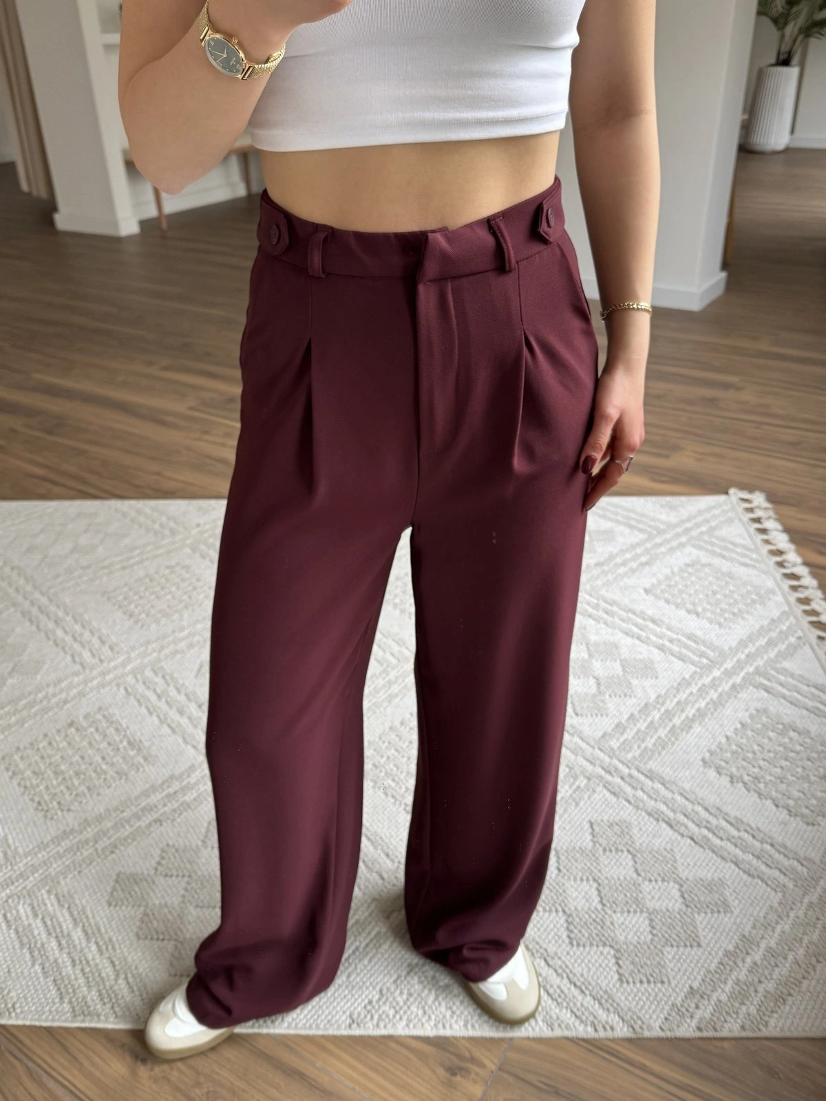 BEL BRİT DÜĞME DETAY PALAZZO KUMAŞ PANTOLON – BORDO