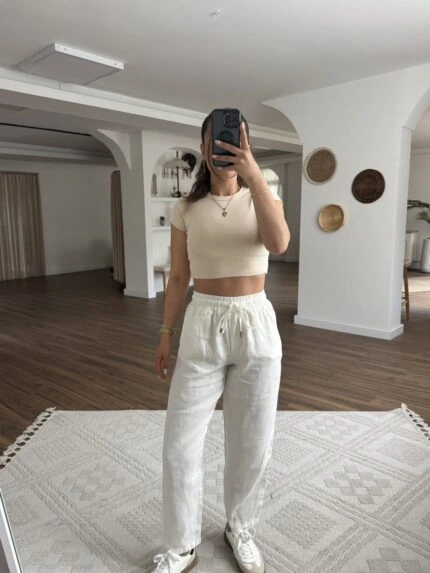 BEL LASTİKLİ CEPLİ HAM KETEN PANTOLON – EKRU
