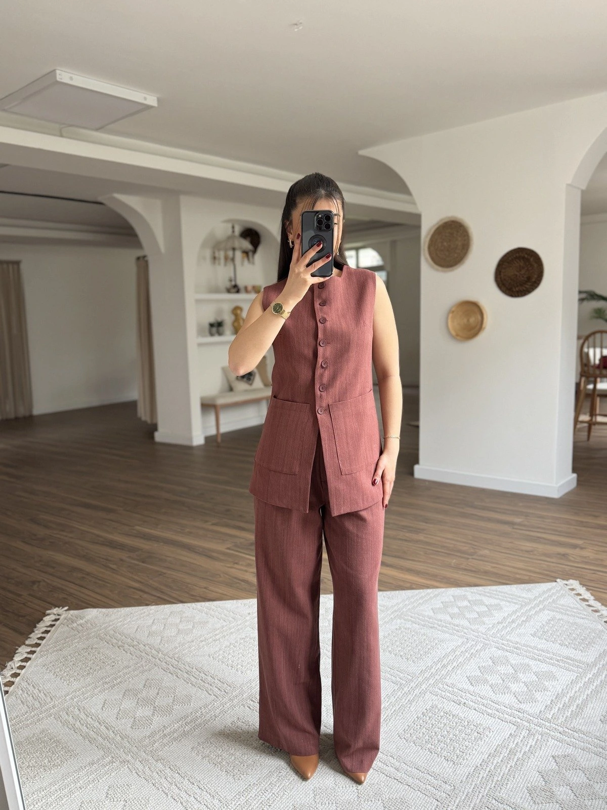 ÇİFT CEPLİ UZUN YELEK ARKA BEL LASTİK PANTOLON PAMUK TAKIM – KİREMİT
