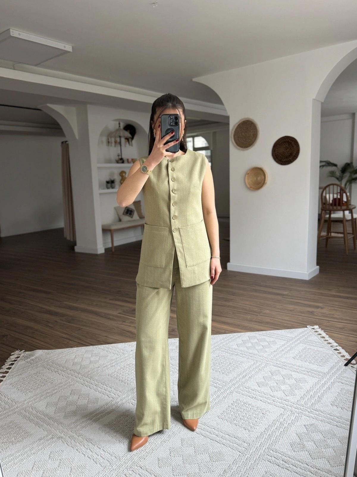ÇİFT CEPLİ UZUN YELEK ARKA BEL LASTİK PANTOLON PAMUK TAKIM – ÇAĞLA YEŞİLİ