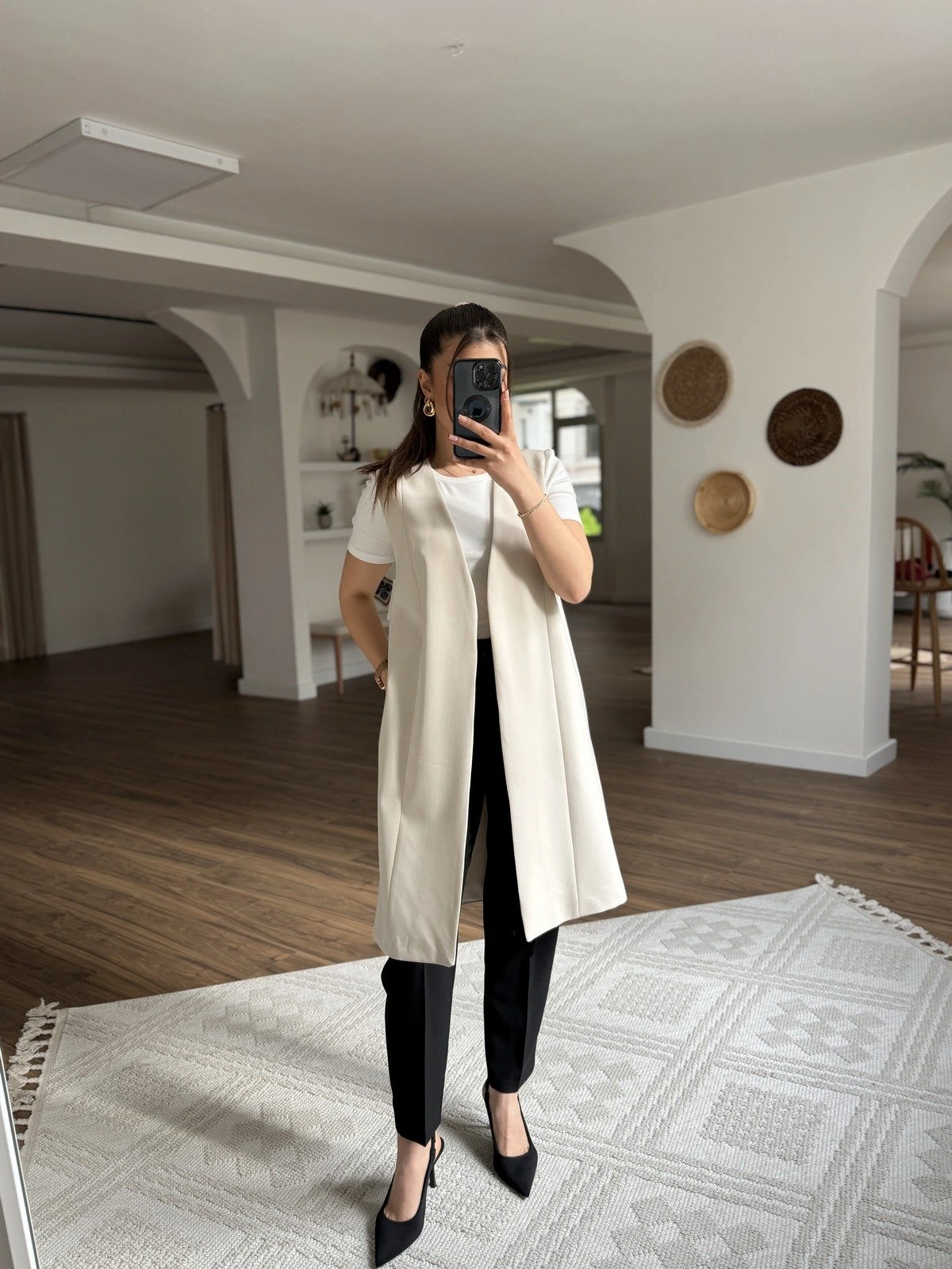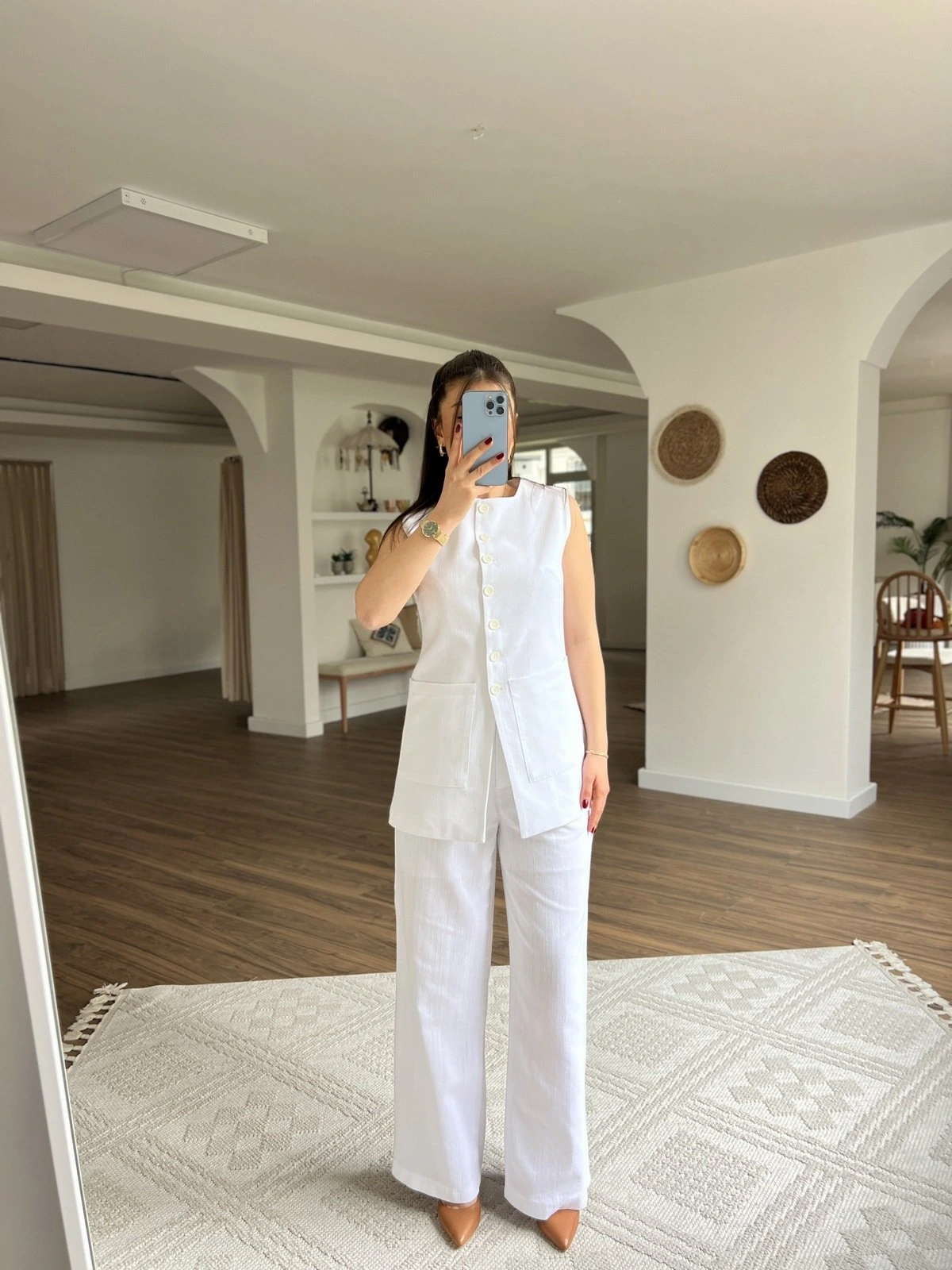 ÇİFT CEPLİ UZUN YELEK ARKA BEL LASTİK PANTOLON PAMUK TAKIM – BEYAZ