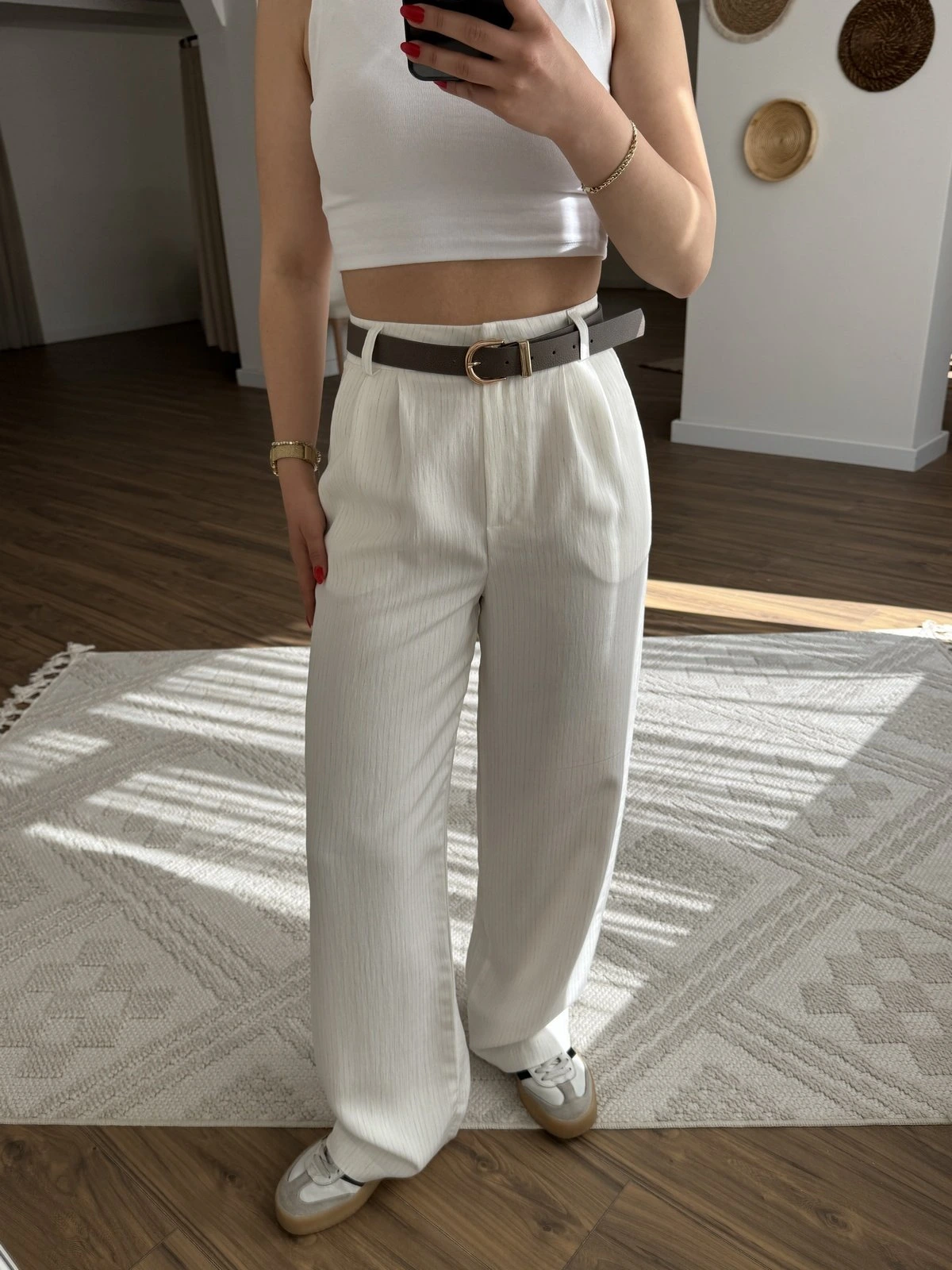 DOKU ÇİZGİ ÖN PİLİ KEMERLİ VİSKON KETEN PALAZZO PANTOLON – BEYAZ