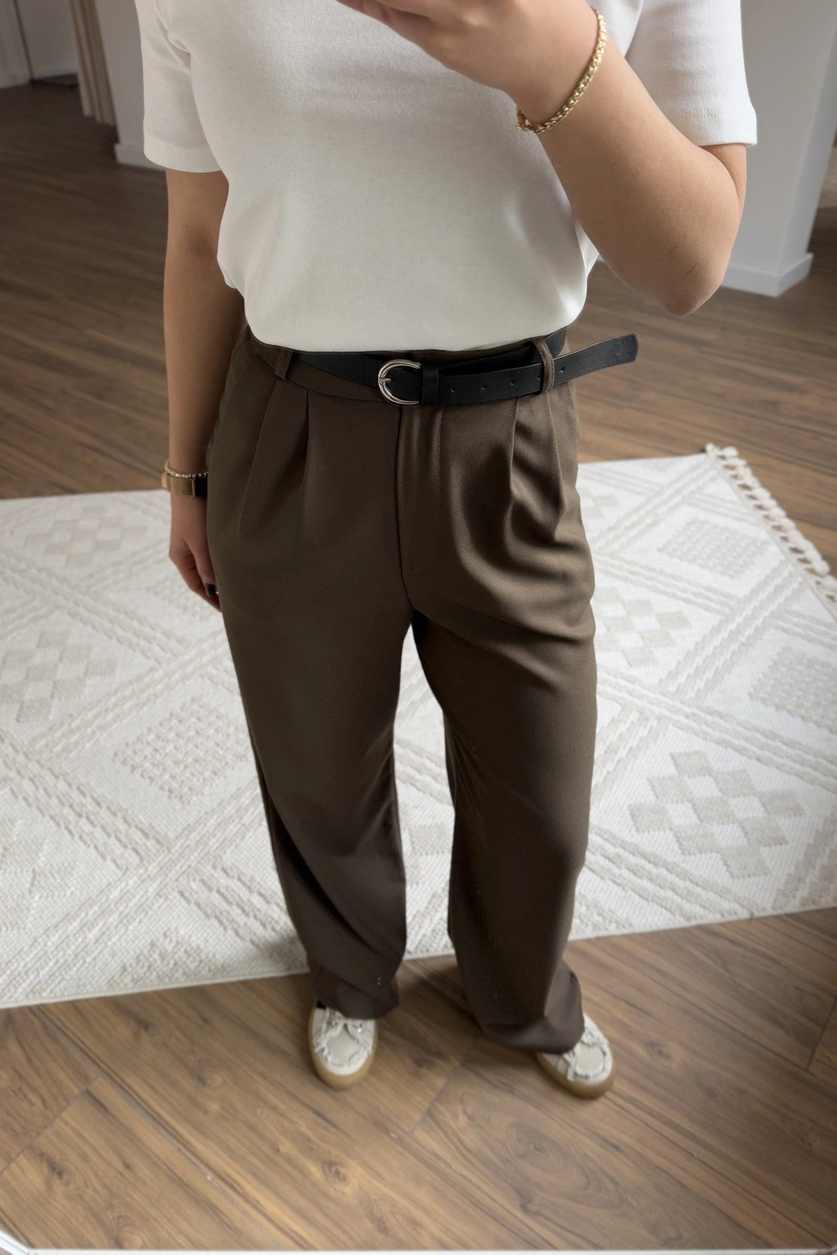 KEMERLİ ÖN PİLİ VİSKON BOL PAÇA KUMAŞ PANTOLON – KOYU KAHVE