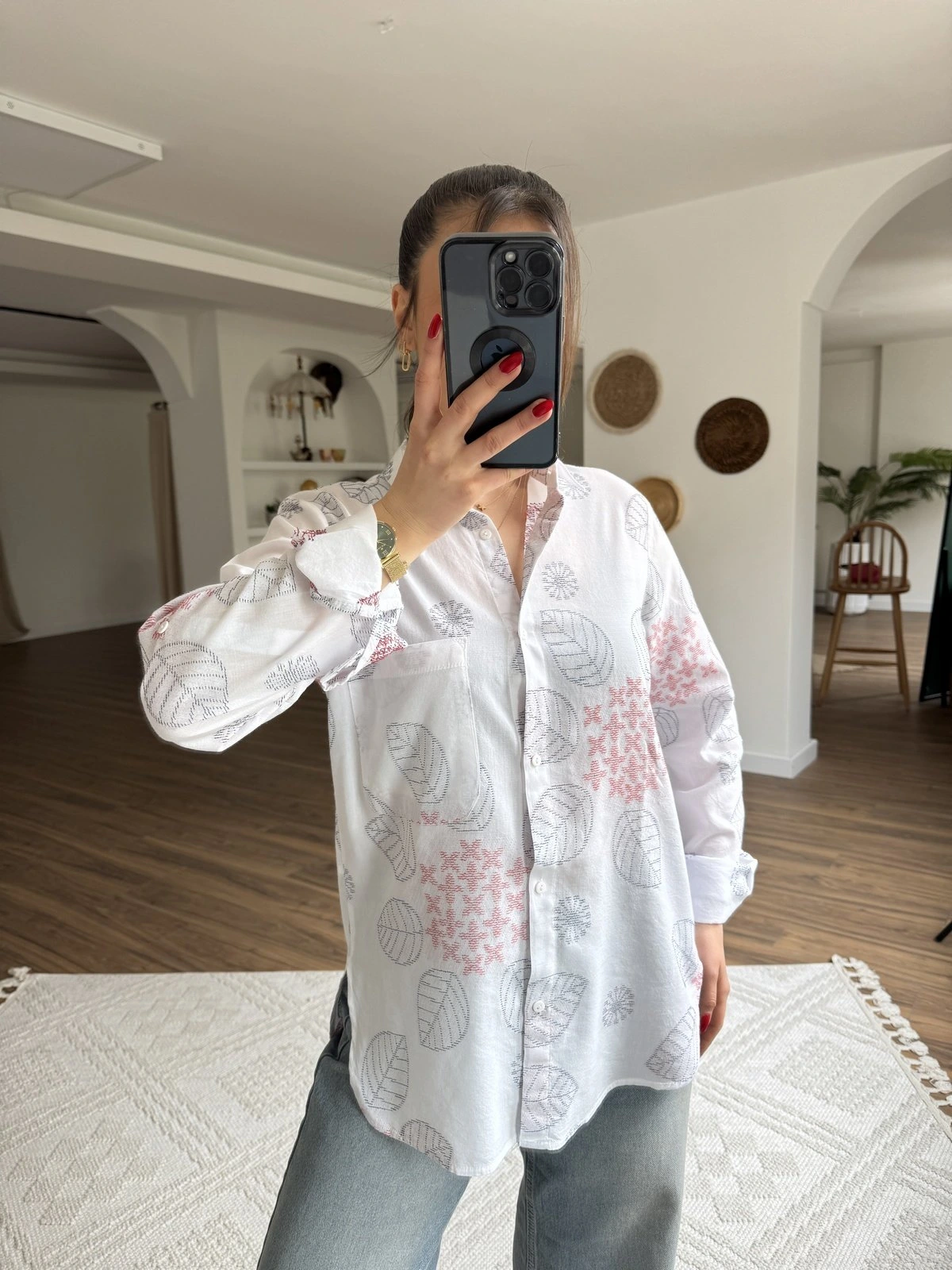 RENKLİ DOKU İŞLEME PAMUK VİSKON SALAŞ GÖMLEK – BEYAZ-KIRMIZI