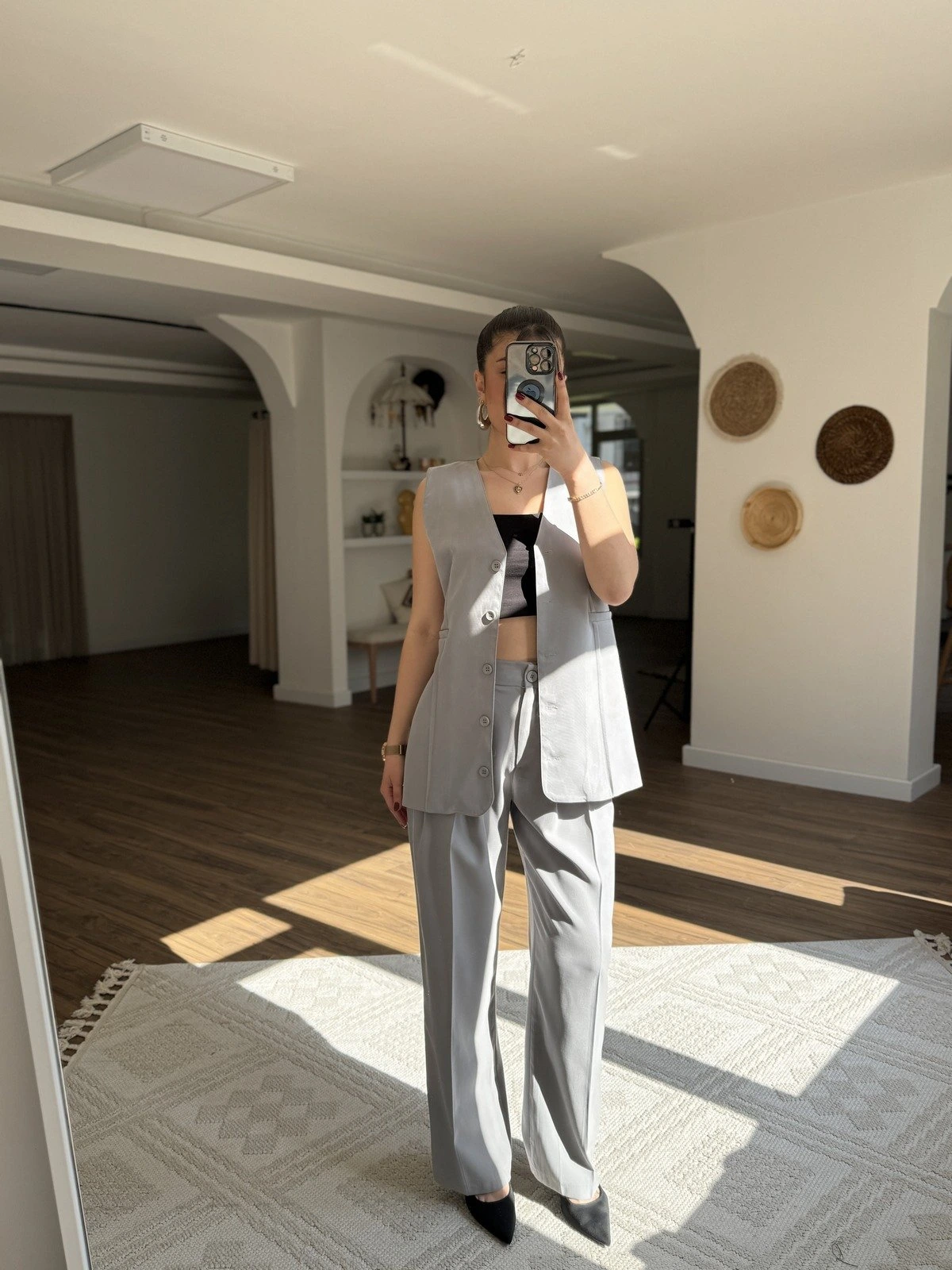 UZUN YELEK PALAZZO PANTOLON PAMUK TAKIM – GRİ