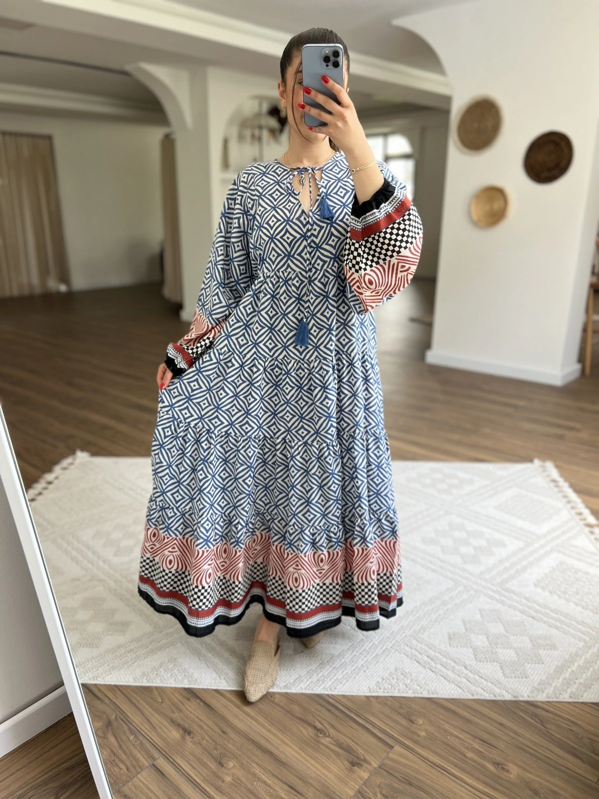 V YAKA BAĞ İPLİ DESENLİ UZUN PAMUK ELBİSE – MAVİ