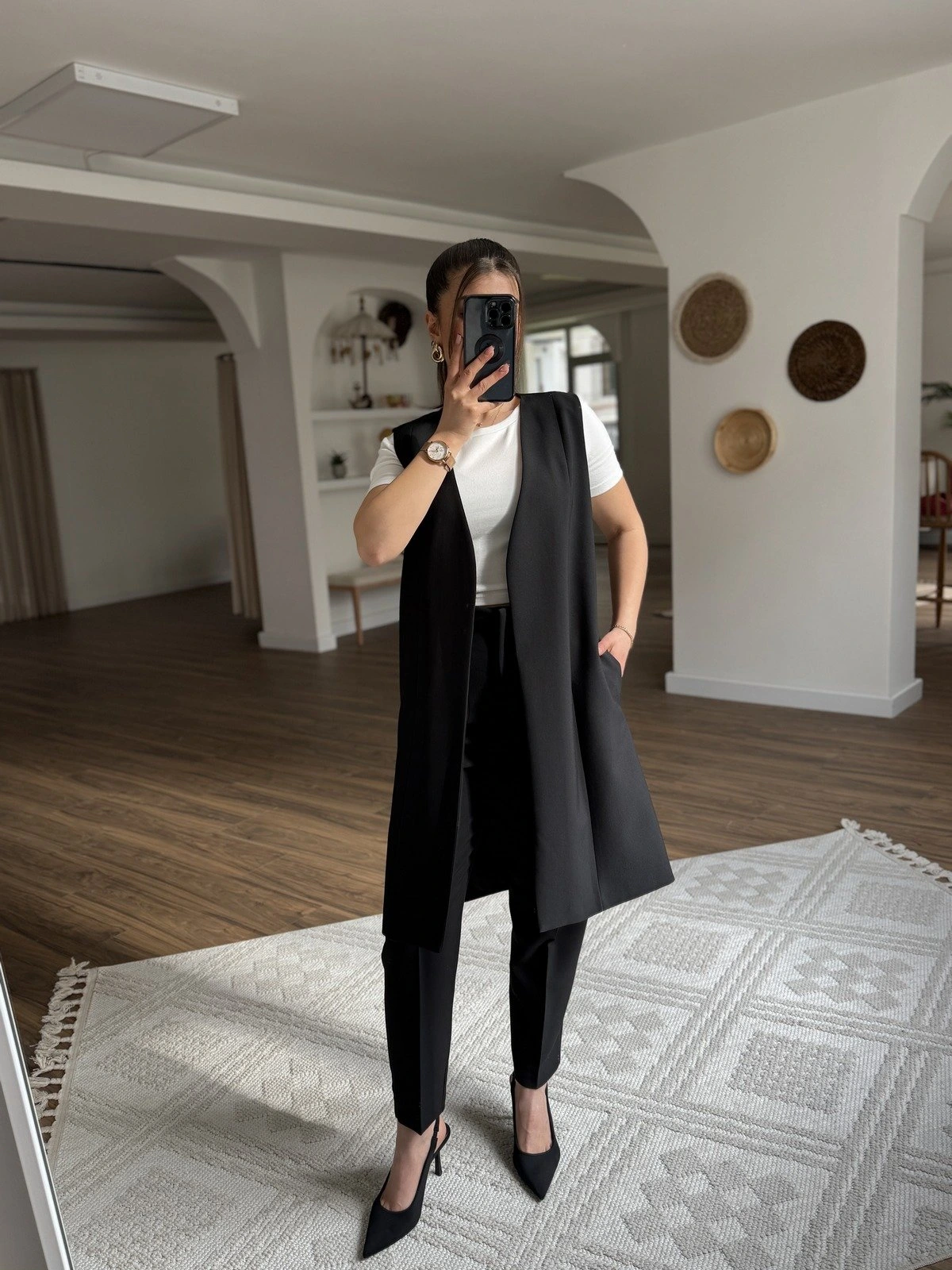 YAN PENCERE DETAY V YAKA UZUN VİSKON KARIŞIM YELEK – SİYAH