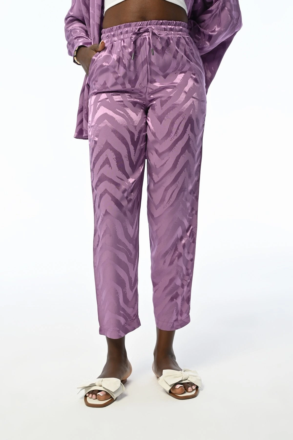 BEL LASTİK CEPLİ KENDİNDEN DESENLİ SATEN VİSKON PANTOLON – MOR
