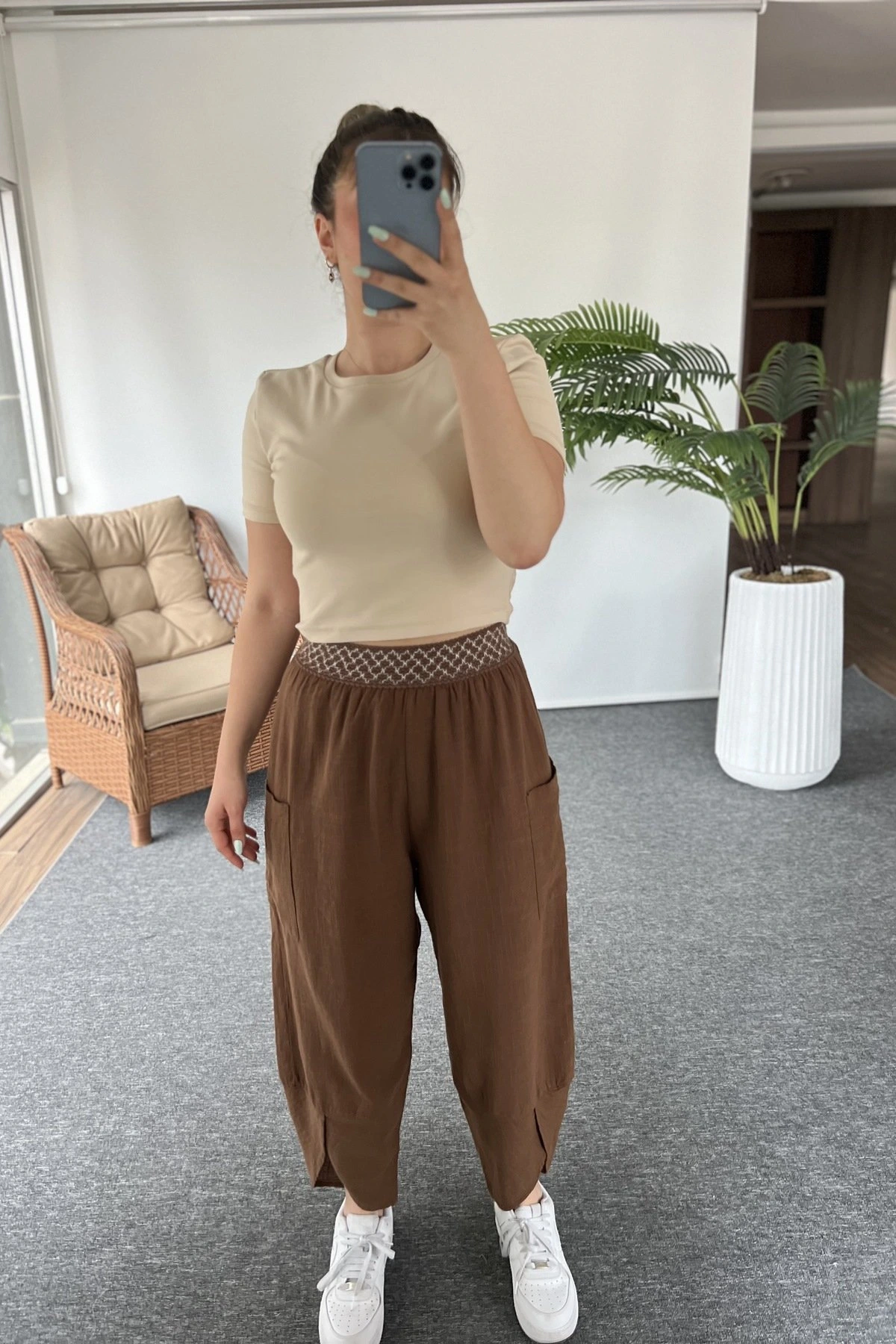 BEL LASTİK DİKİŞ DETAY ASTARLI YAN CEPLİ ÖN BİLEK YIRTMAÇLI PAMUK PANTOLON – KAHVE