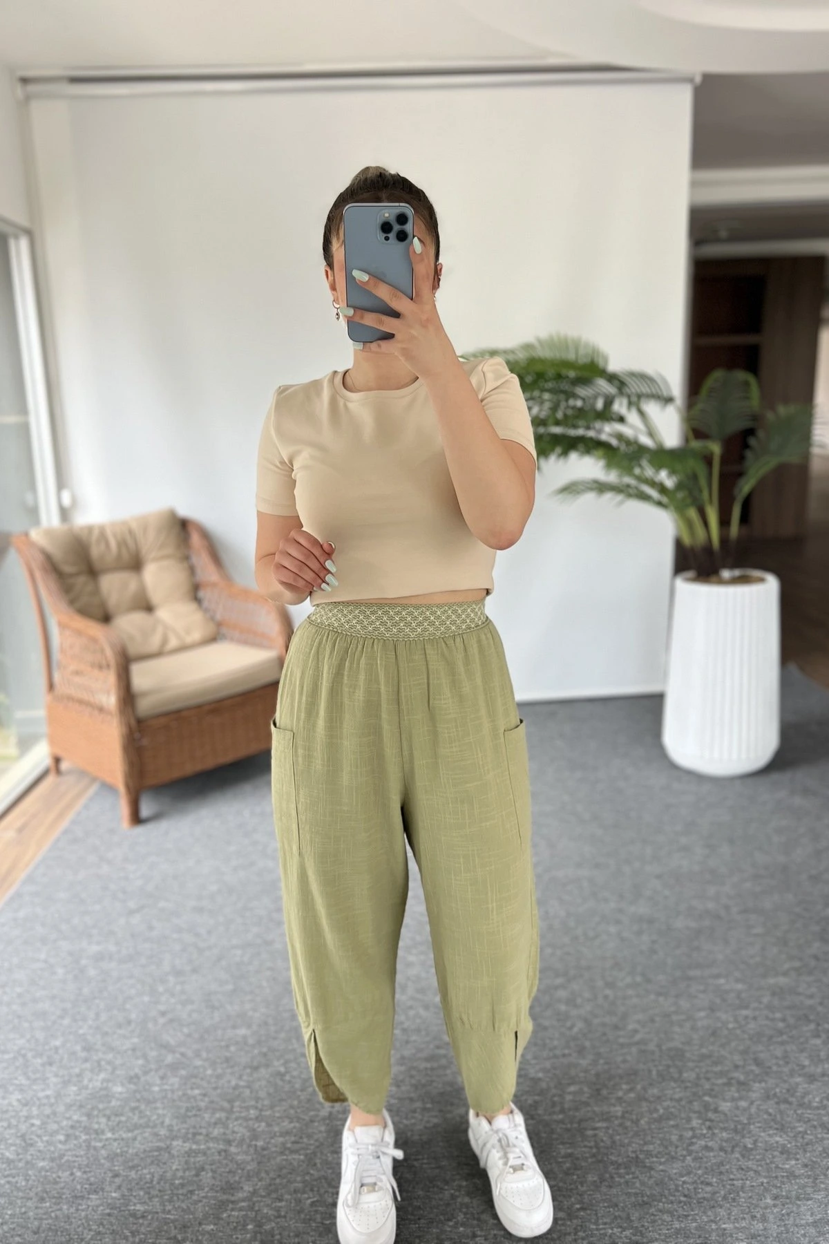 BEL LASTİK DİKİŞ DETAY ASTARLI YAN CEPLİ ÖN BİLEK YIRTMAÇLI PAMUK PANTOLON – HAKİ