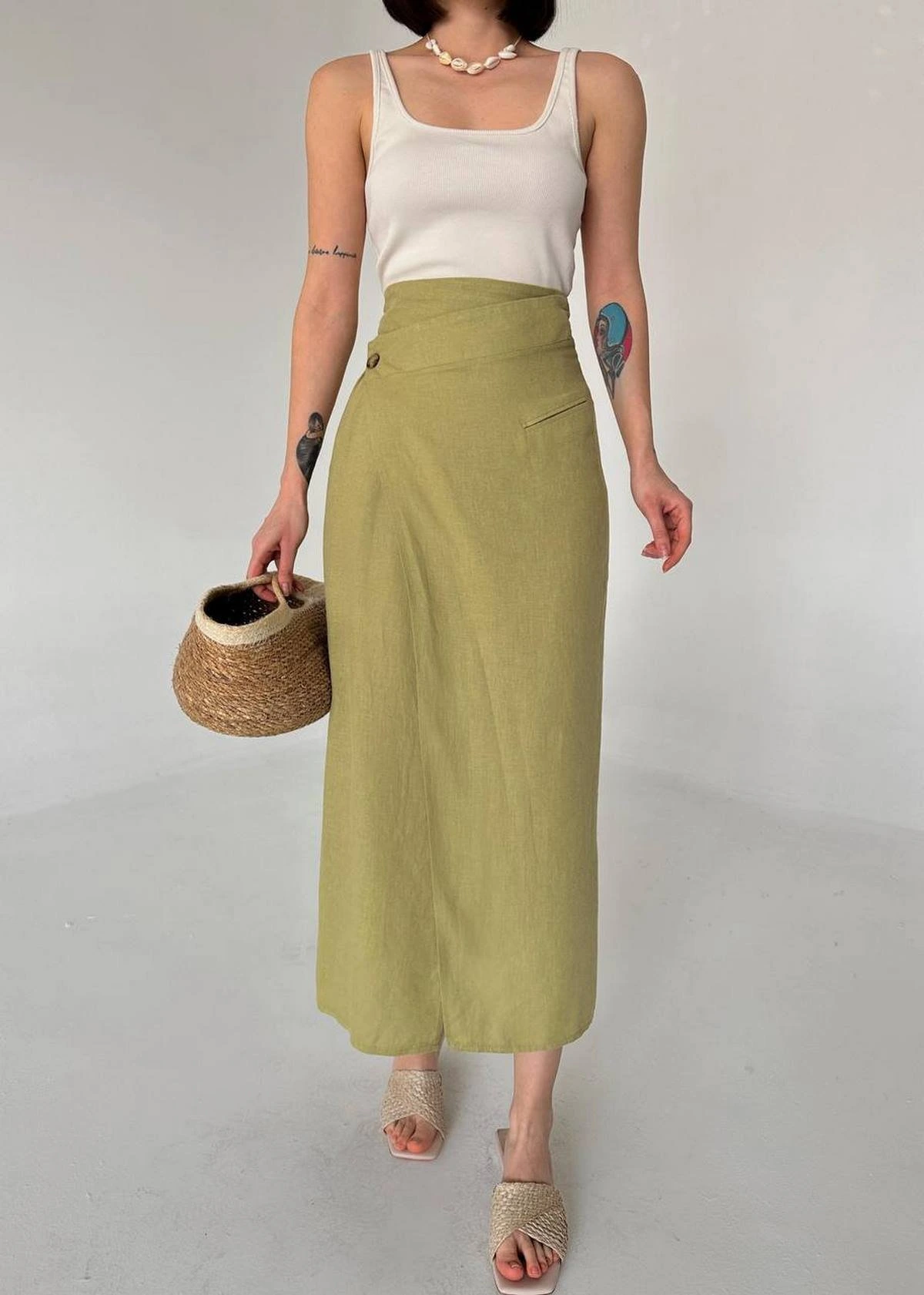 KRUVAZE KAPAK DÜĞME PAMUK MİDİ ETEK – HAKİ