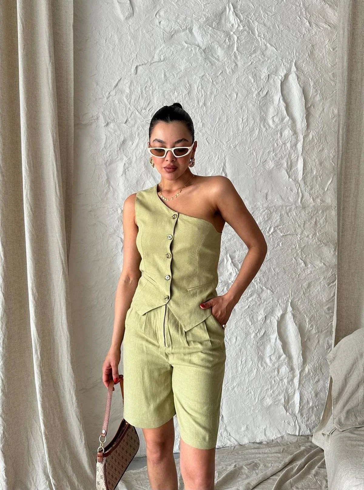 ÖN ÇİFT PİLE ASTARLI PAMUK BERMUDA ŞORT – VİZON