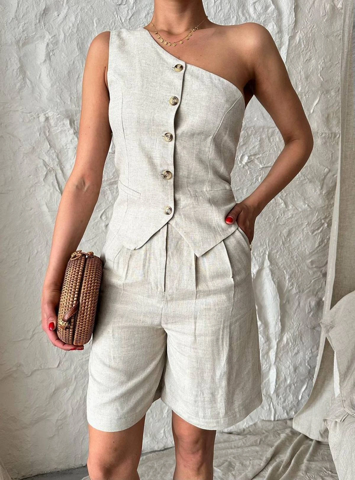 ÖN ÇİFT PİLE ASTARLI PAMUK BERMUDA ŞORT – EKRU