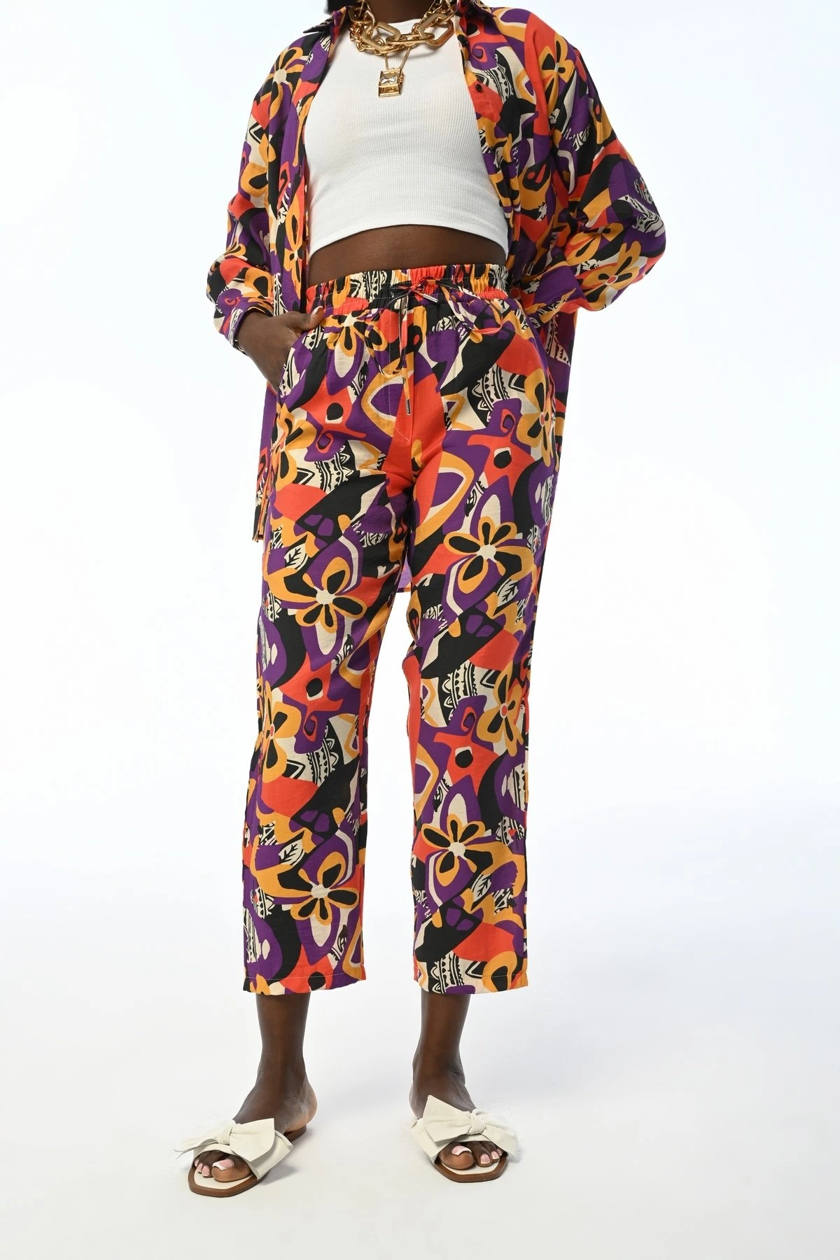 RENKLİ DESENLİ BEL LASTİK CEPLİ MODAL PANTOLON – RENKLİ