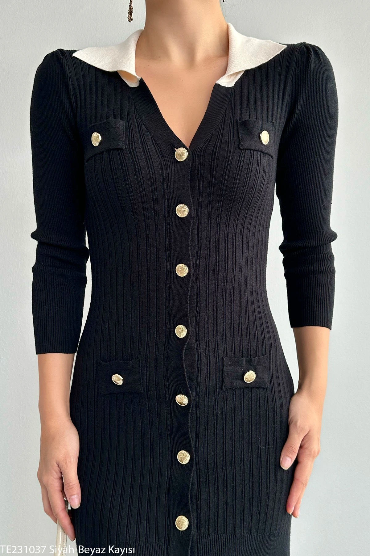 POLO YAKA DÜĞMELİ VİSKON TRİKO ÇAN ELBİSE – SİYAH BEYAZ