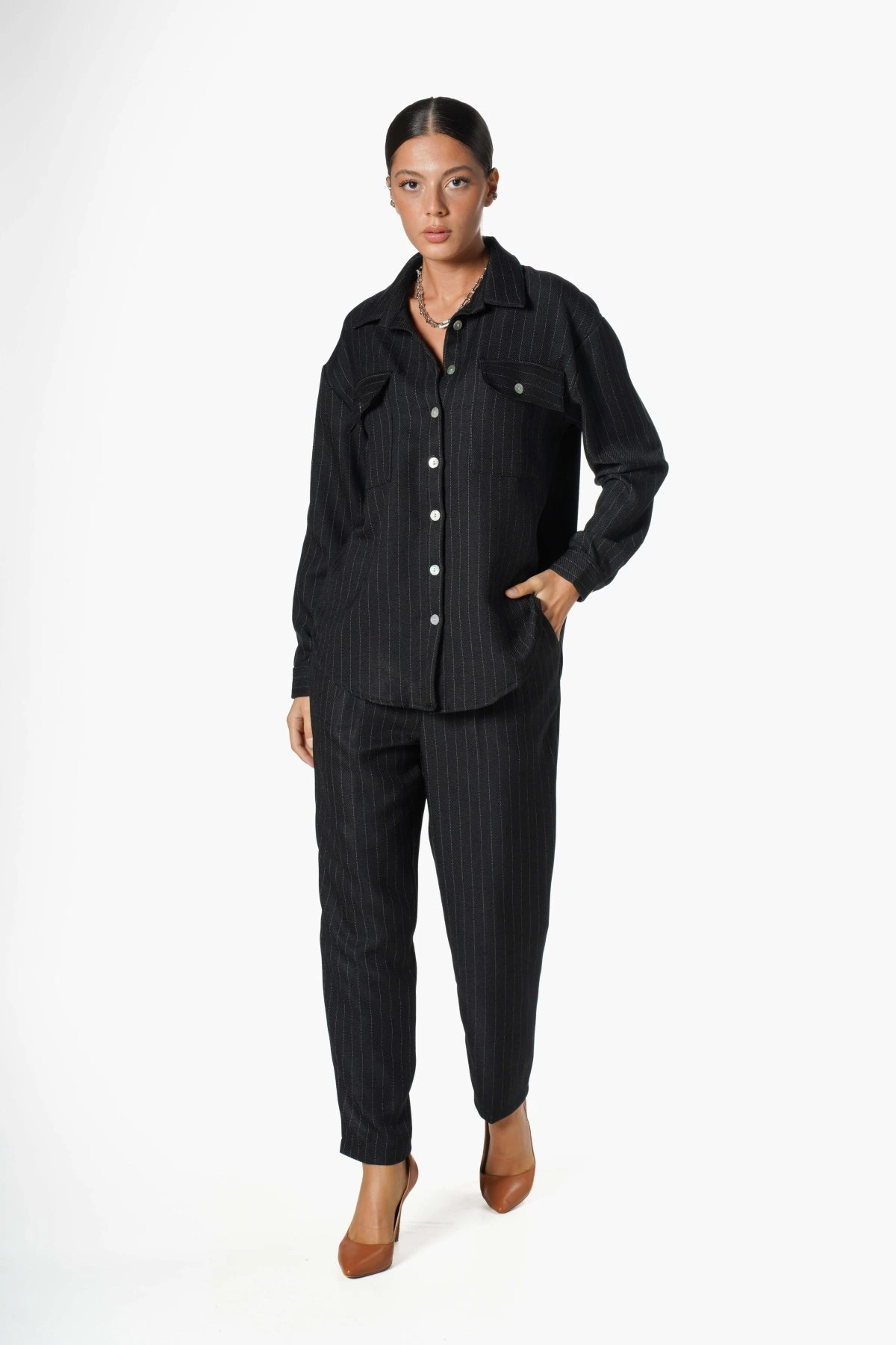 YÜN EFEKT ÇİZGİLİ ÇİFT CEP SALAŞ GÖMLEK – SİYAH