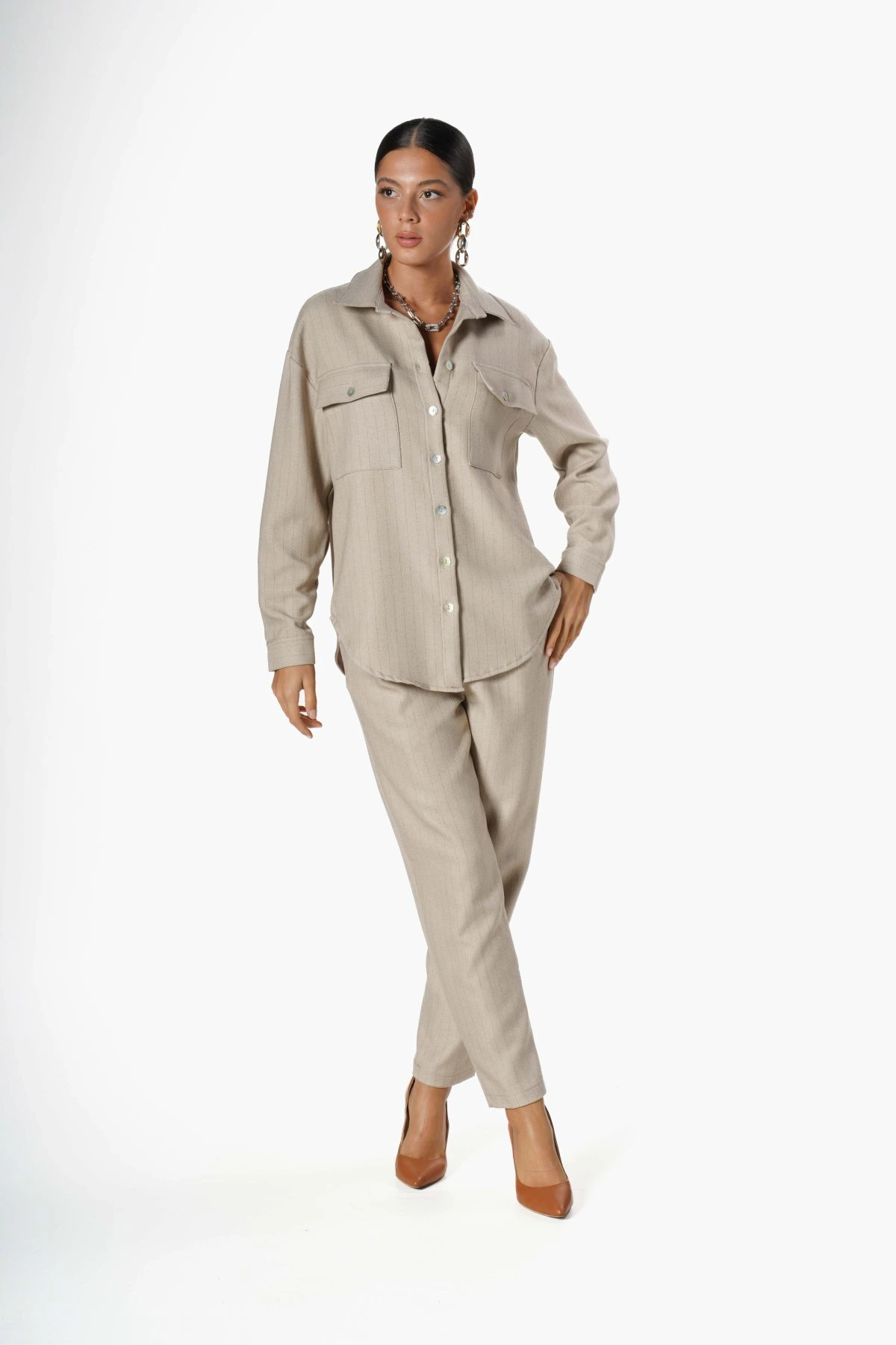 YÜN EFEKT ÇİZGİLİ ÇİFT CEP SALAŞ GÖMLEK – KARAMEL