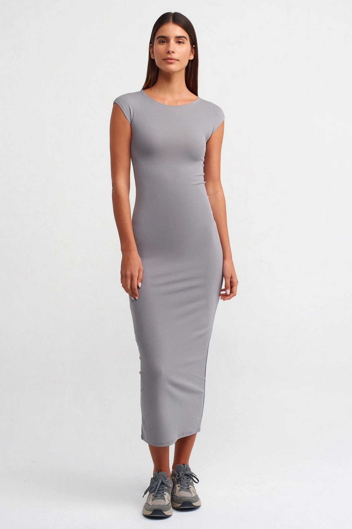 ASKILI YAN DRAPE MİDİ BOY VİSKON ELBİSE – GRİ