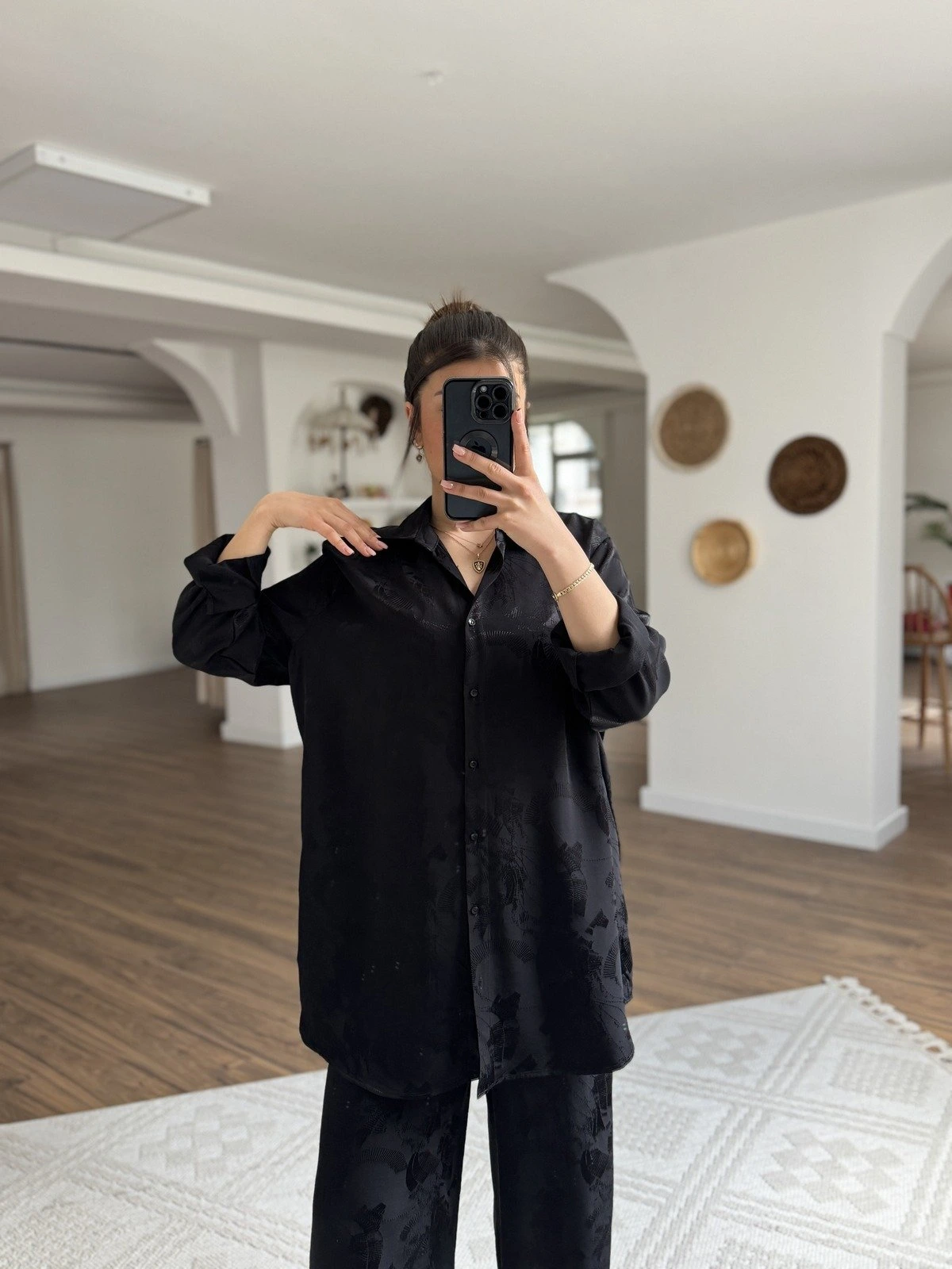 PARLAK DESEN DOKU İPEK VİSKON UZUN GÖMLEK – SİYAH