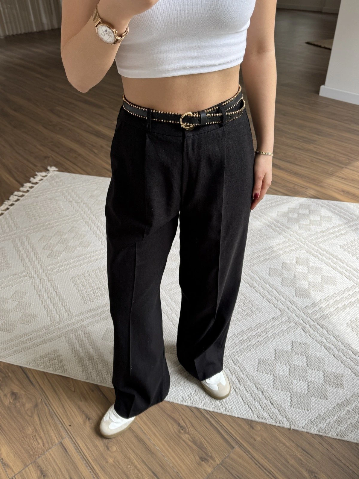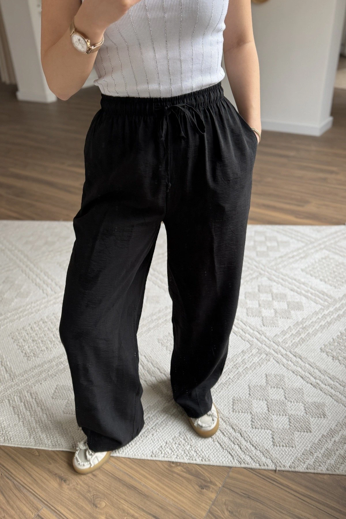 ARKA BEL LASTİK BOL PAÇA KETEN VİSKON PANTOLON – SİYAH